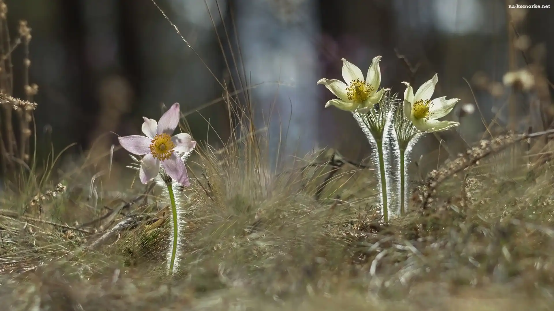 Kwiaty, Sasanki, Trawa, Trzy, Rozmycie na Komórkę