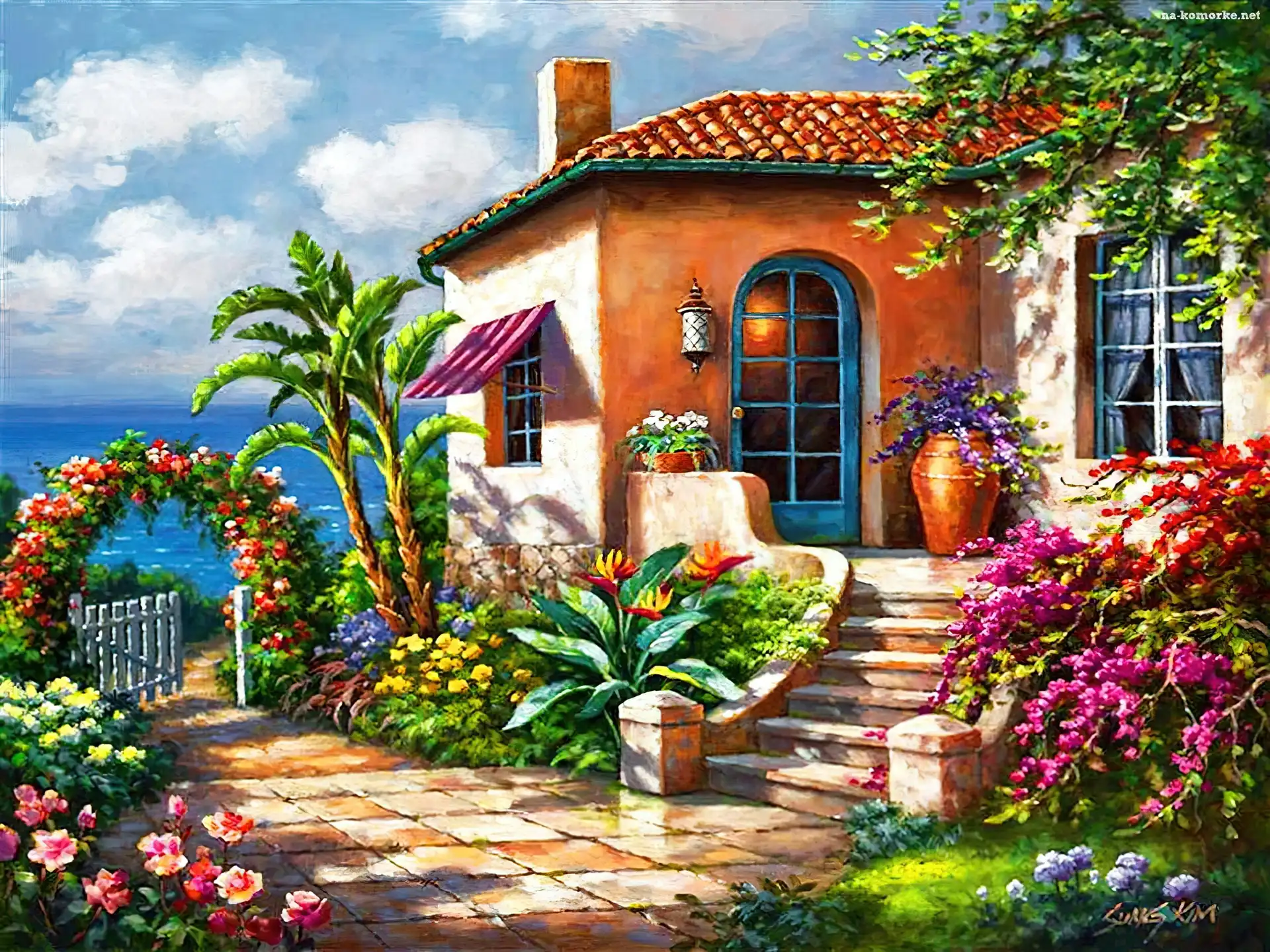 Dom, Schody, Bramka, Ogród, Widok, Morze, Kwiaty na Komórkę