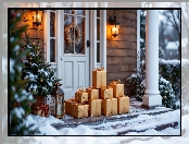 Schody, Prezenty, Boże Narodzenie, Lampiony, Drzwi, Dom, Zima, Ośnieżone, Choinka na Komórkę