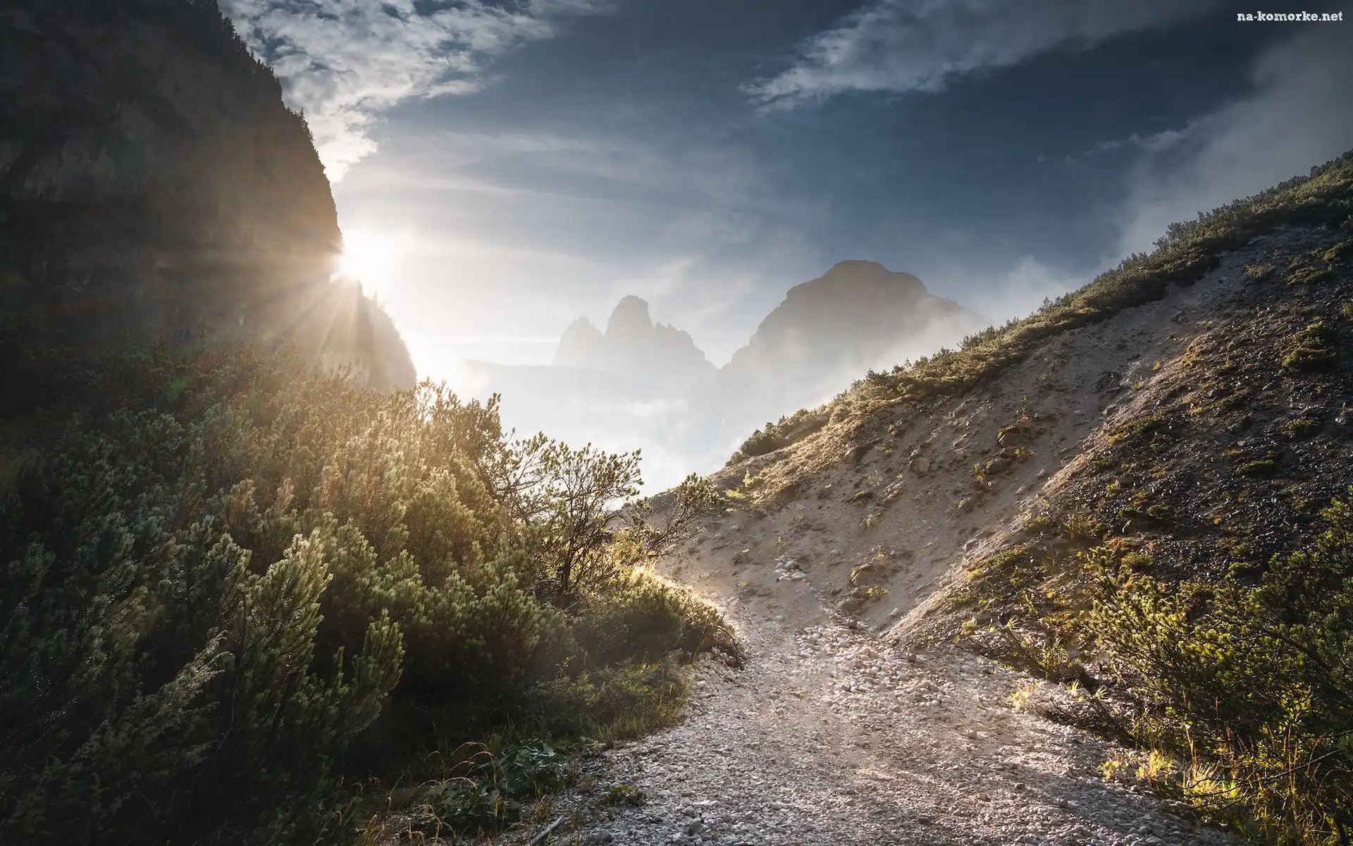 Krzewy, Ścieżka, Góry, Wschód słońca na Komórkę
