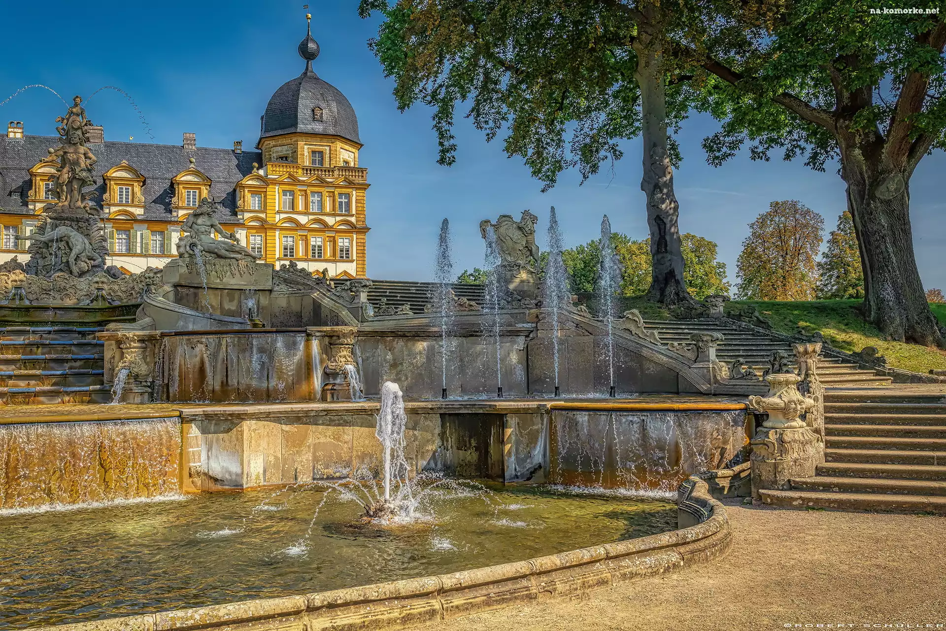 Zamek Seehof, Bawaria, Niemcy, Fontanna, Schody, Drzewo, Bamberg na Komórkę