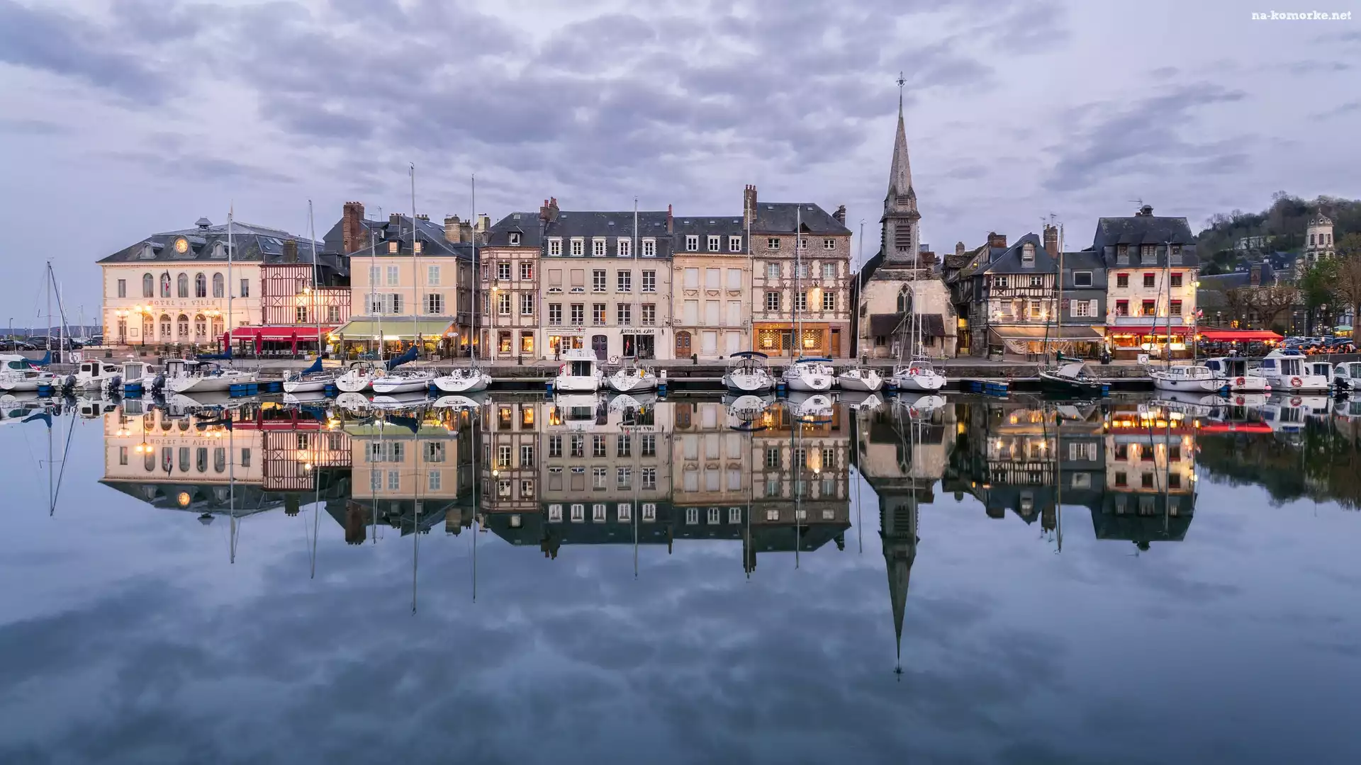 Francja, Port, Honfleur, Odbicie, Normandia, Domy, Jachty, Rzeka Sekwana na Komórkę