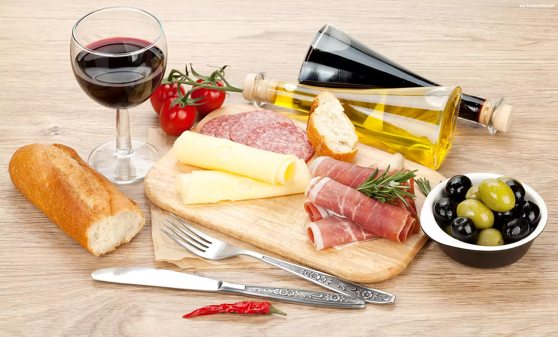 Ser, Deska, Szynka, Papryka, Oliwki, Oliwa, Bagietka, Widelec, Nóż, Salami, Miseczka, Kieliszek, Pomidorki na Komórkę |