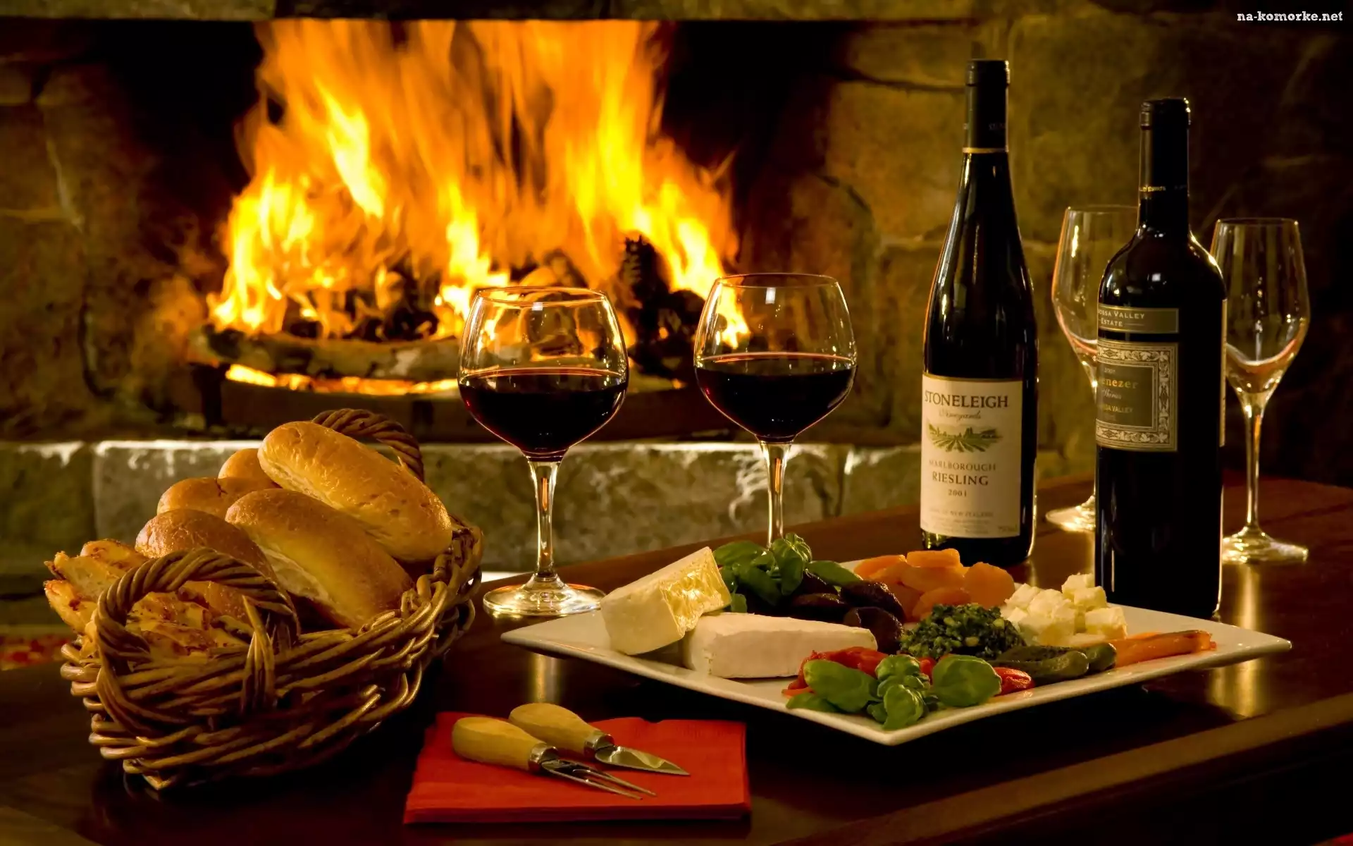 Wnętrze, Ser, Bułki, Kominek, Ogień, Wino, Kieliszki na Komórkę