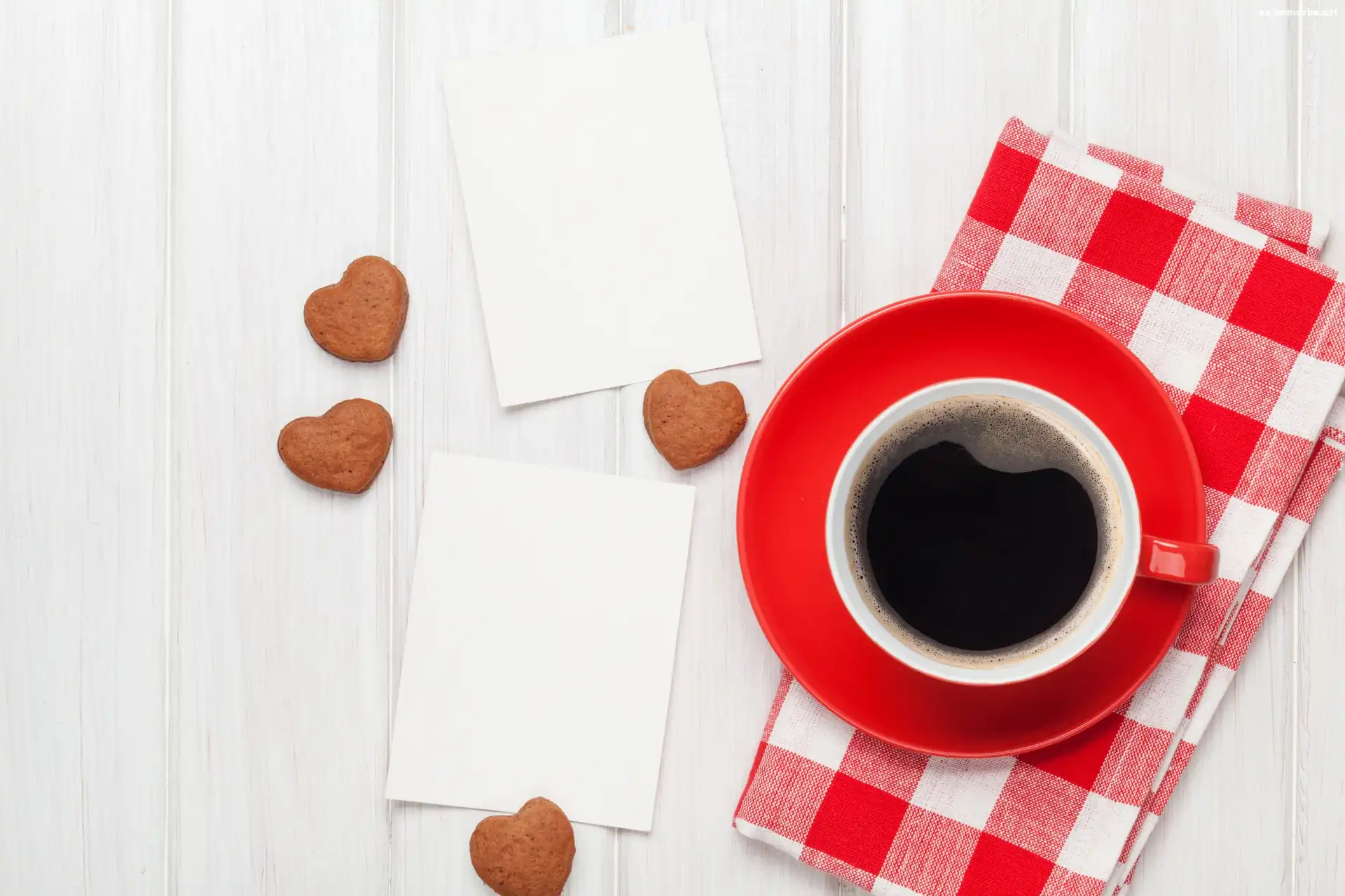 Filiżanka, Kawa, Ciasteczka, Ręcznik, Blat, Czerwona, Drewniany, Kartki, Serduszka na Komórkę