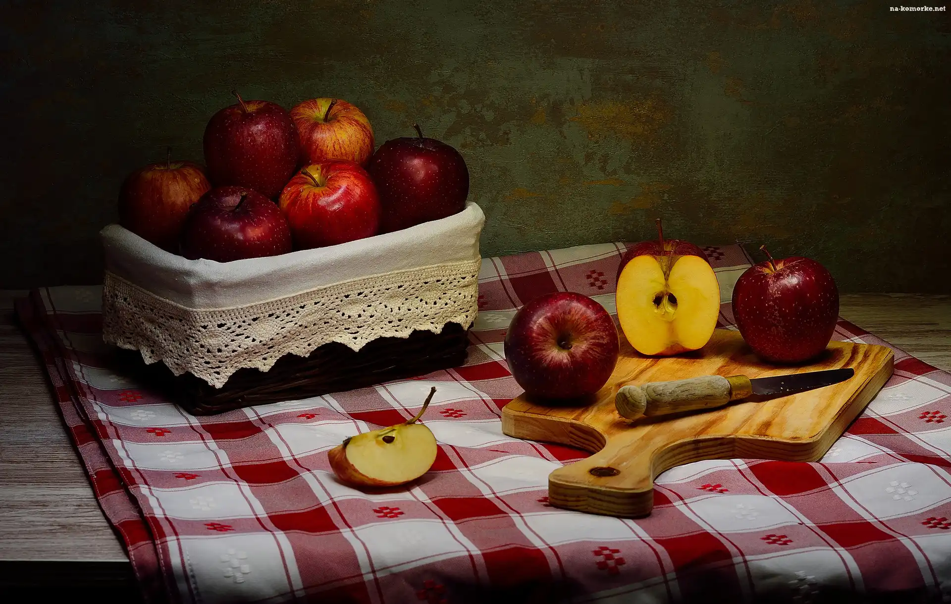 Serweta, Jabłka, Koszyczek, Deska, Nóż na Komórkę