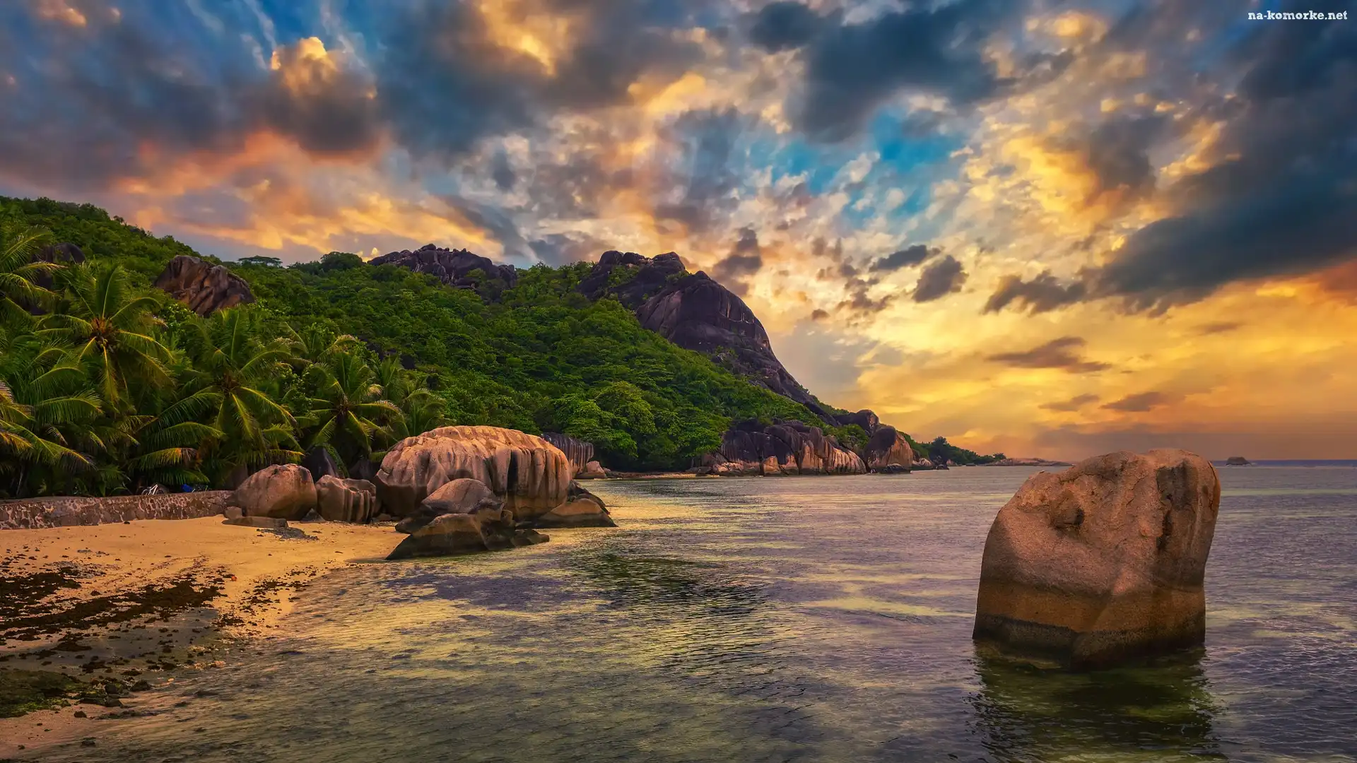 Skały, Palmy, Wyspa, Zachód słońca, La Digue, Seszele, Plaża, Anse Source dArgent Beach, Morze, Góry na Komórkę |