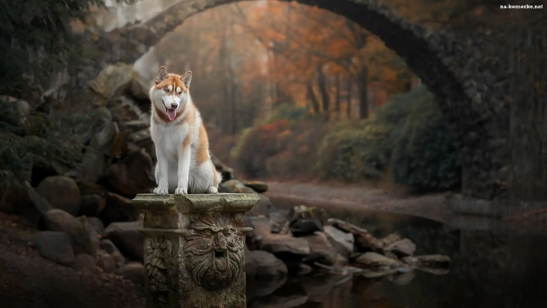 Kamienie, Siberian husky, Pies, Potok, Postument, Mostek na Komórkę