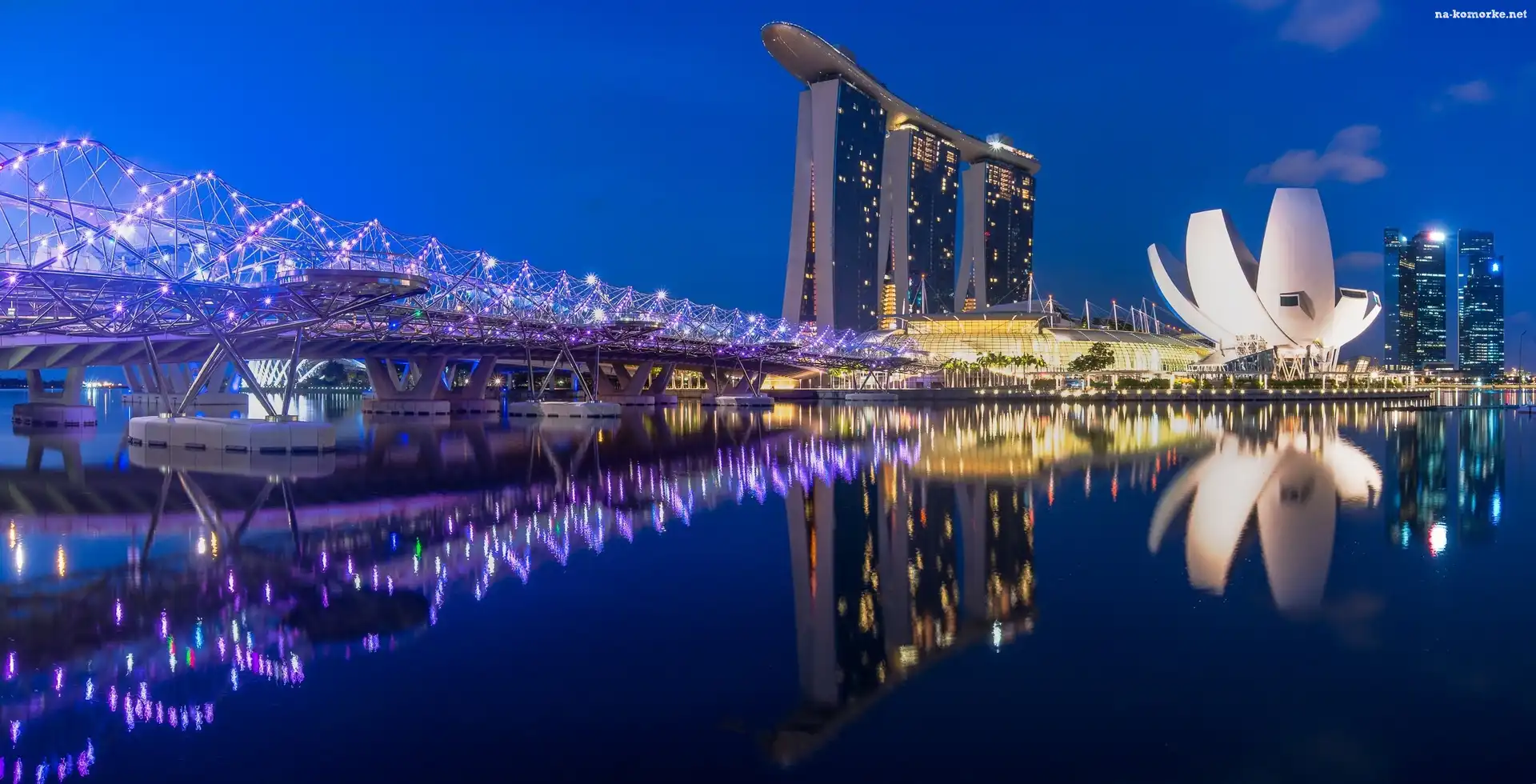 , Noc, Sztucznych Drapacze Chmur, Oświetlenie, Singapur Zniszczone, Miasto Fajerwerki, Przystań, Jachtowa Most, Wieżowce, Singapur, Miasto nocą, Światła, Zatoka Singapur, Staw, Lilie wodne, Hotel Marina Bay Sands, Futurystyczny ogród Gardens by the Bay Rysunek, Wenecja Europa, Miasto Kanały, Amsterdam, Rzeka, Most Hotel Fullerton Bay, Singapur Rzeka, Noc, Światła, Diabelski, Młyn Francja, Rzeka, Paryż, Most Most, Niebo, Rzeka Miasto, Surrealistyczne