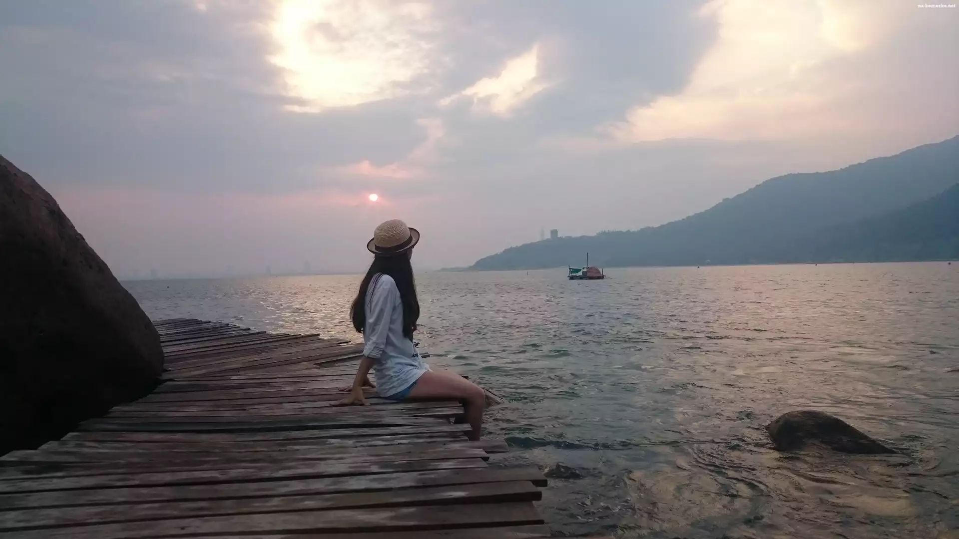 Skała, Zachód Słońca, Morze, Kobieta, Pomost na Komórkę