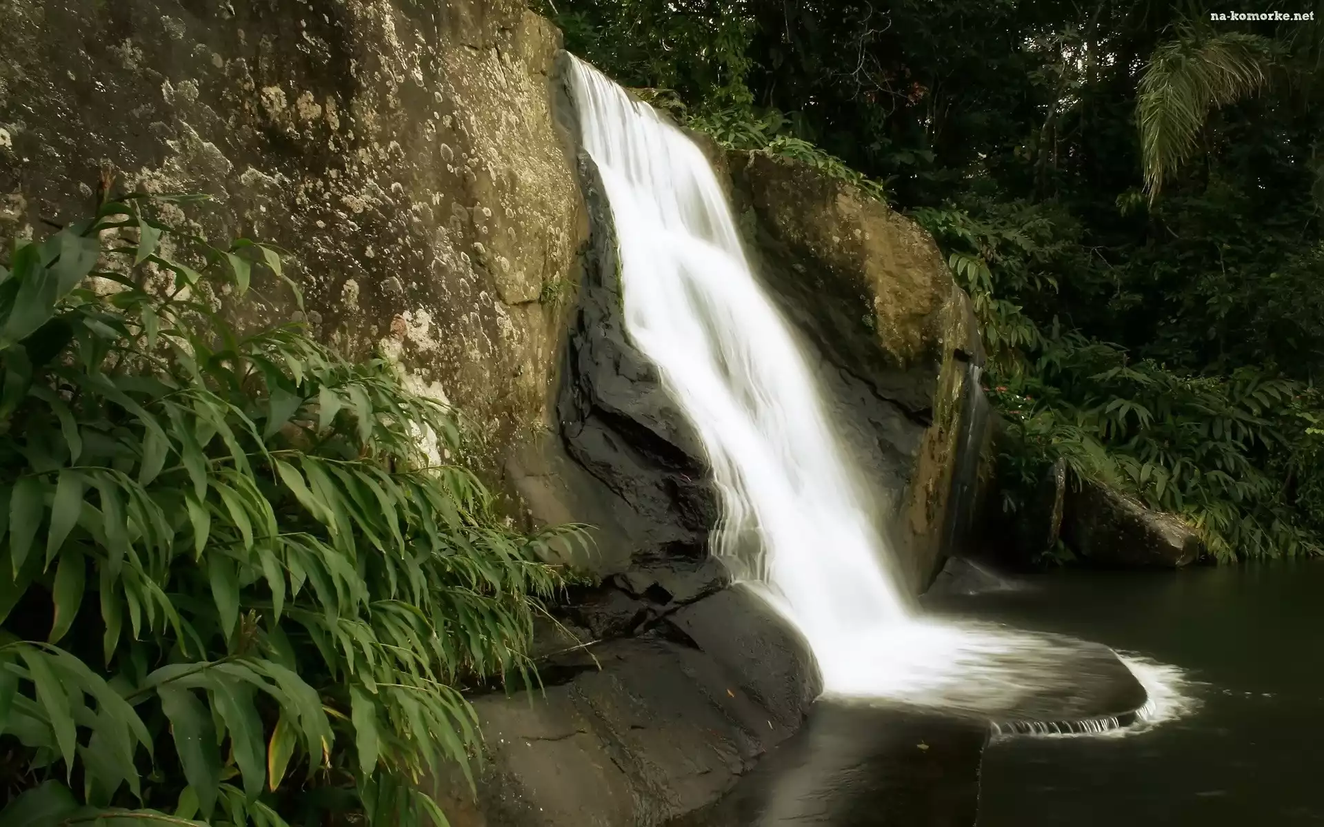 Skała, Zielone, Krzewy, Rzeka, Wodospad na Komórkę