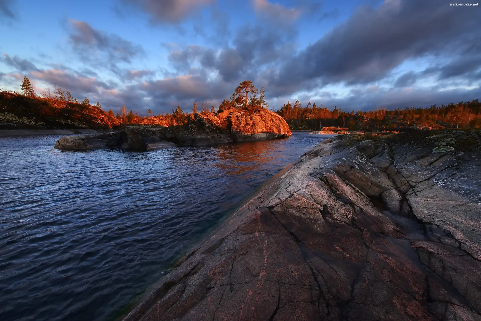 Chmury, Skały, Jezioro Ładoga, Rosja, Drzewo, Karelia na Komórkę