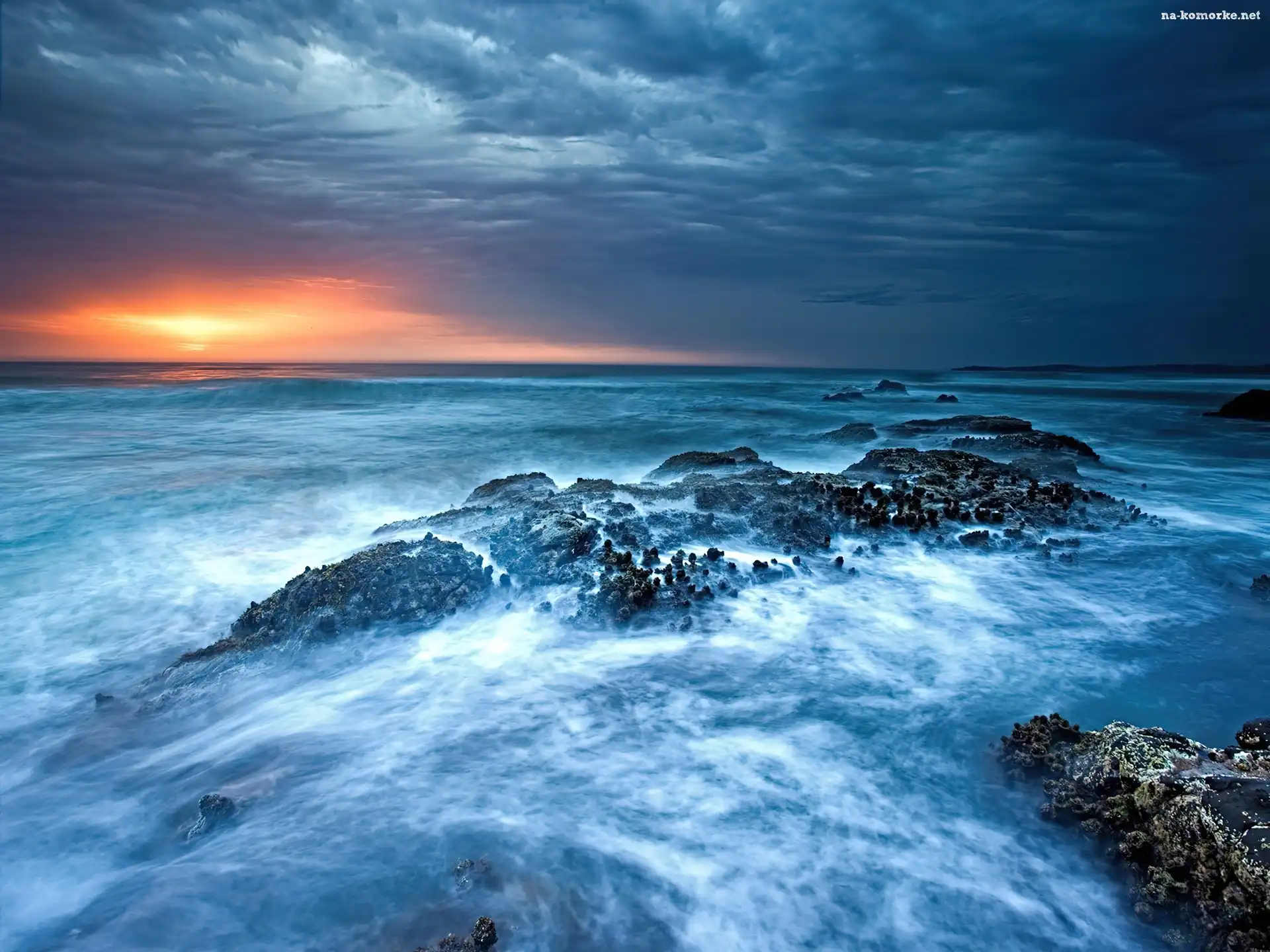 Skały, Zachód, Słońca, Fale, Morze na Komórkę