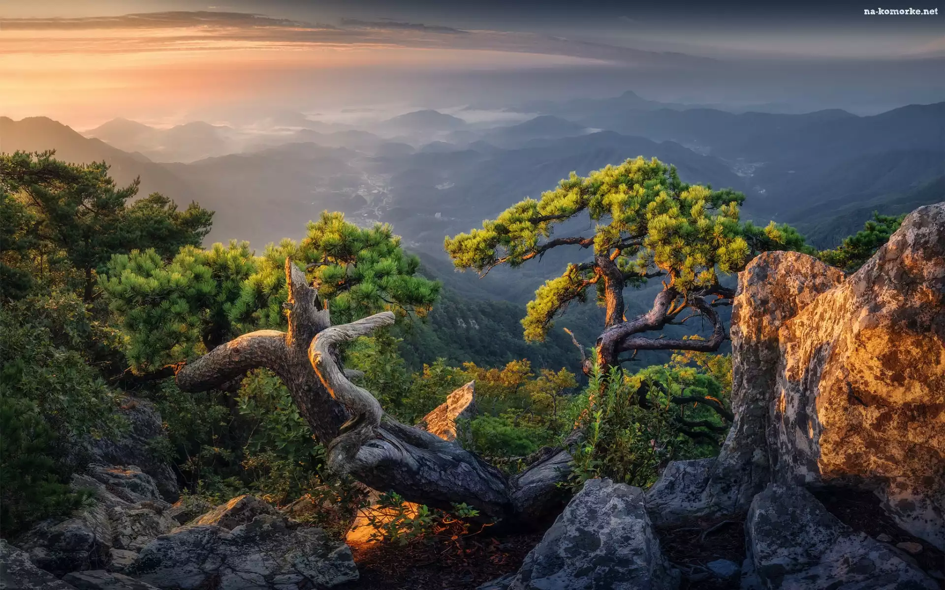 Kamienie, Chmury, Góry, Wschód słońca, Drzewa, Sosny, Skały na Komórkę