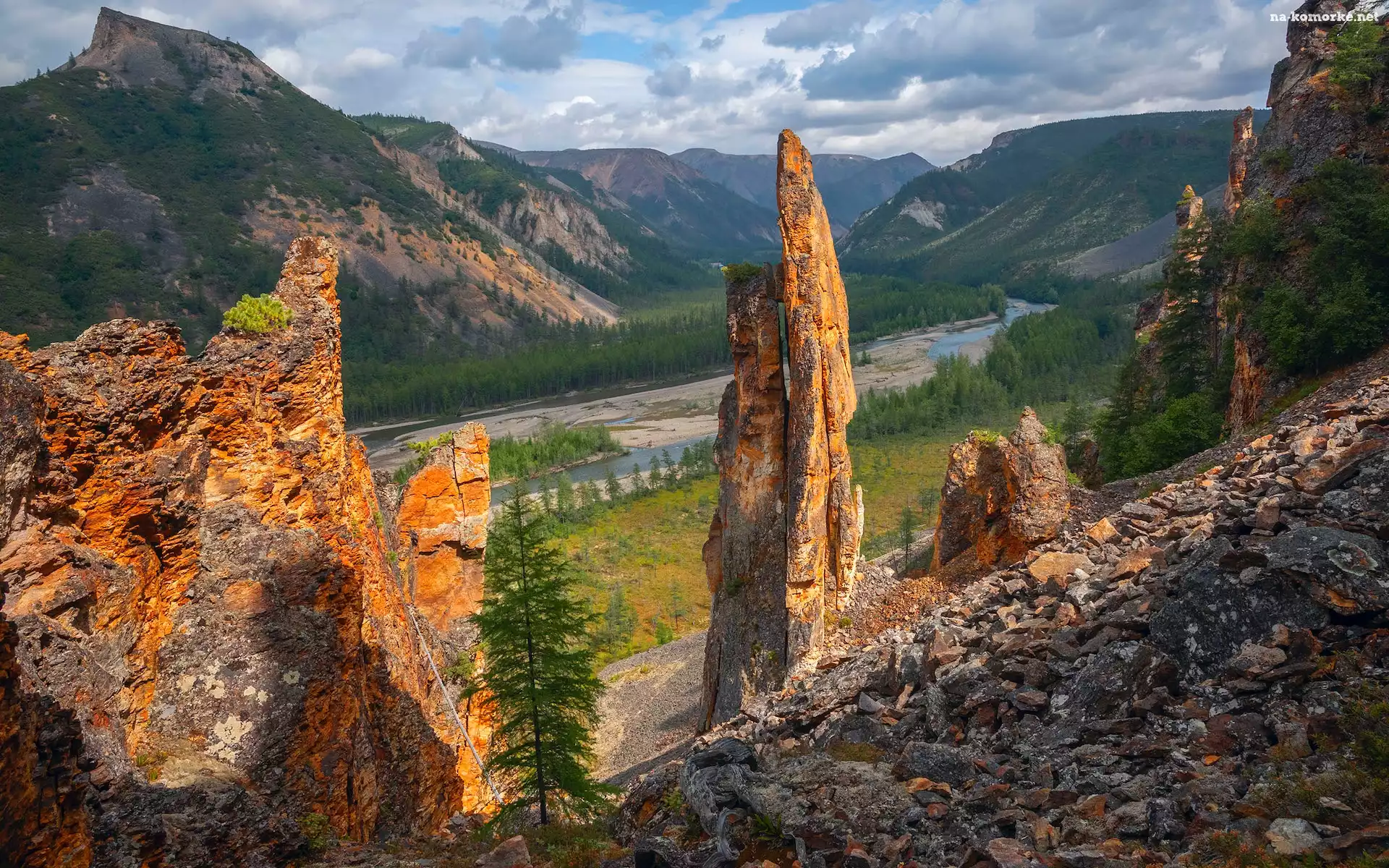 Dolina, Skały, Góry, Rzeka, Drzewa na Komórkę