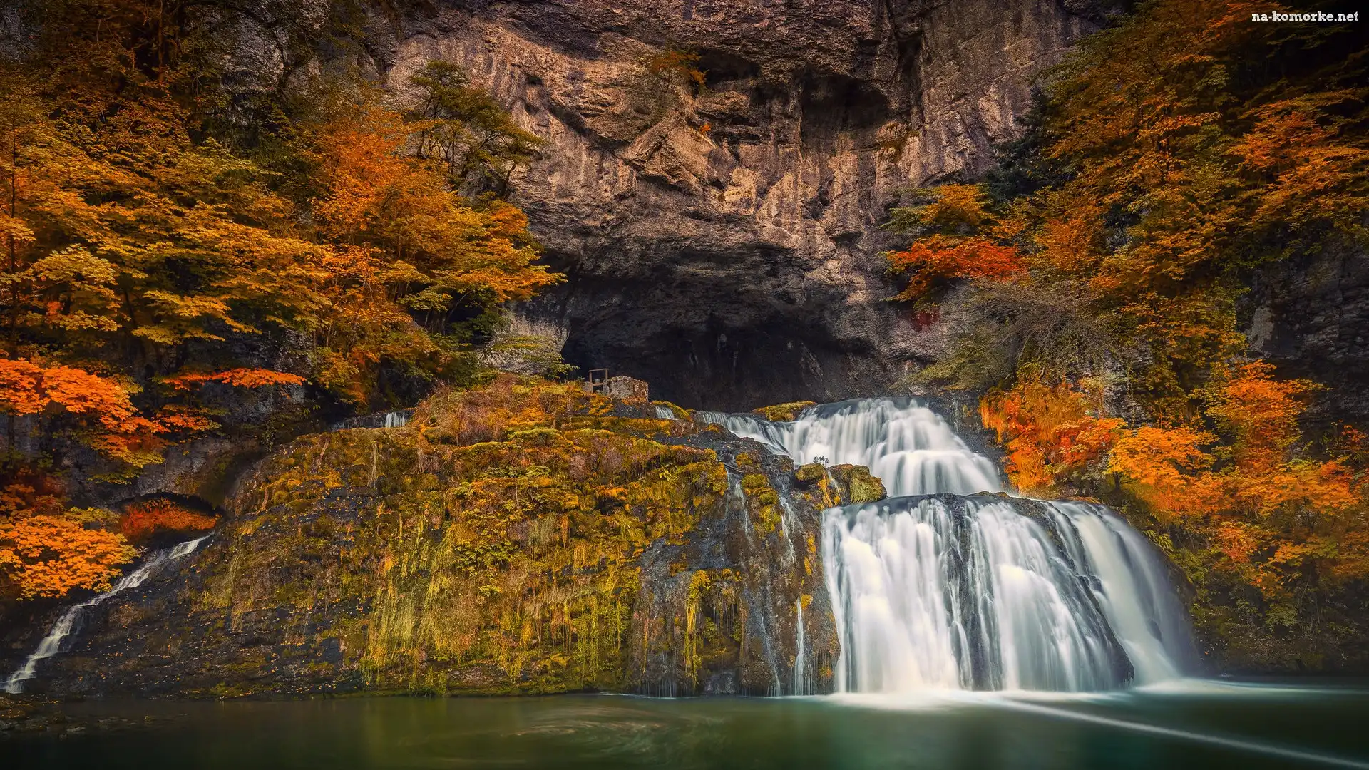 Skały, Drzewa, Las, Wodospad, Jesień, Grota na Komórkę