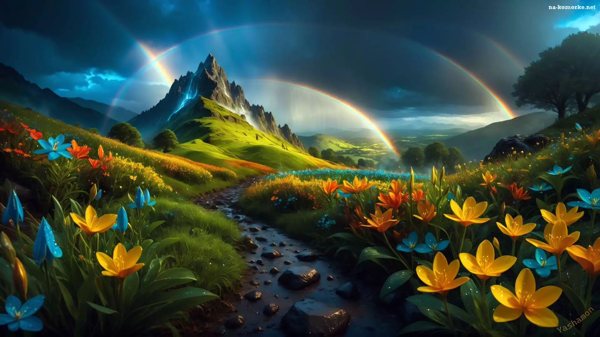 Tęcza, Drzewa, Kwiaty, Góry, Kamienie, Grafika, Strumień, Skały na Komórkę