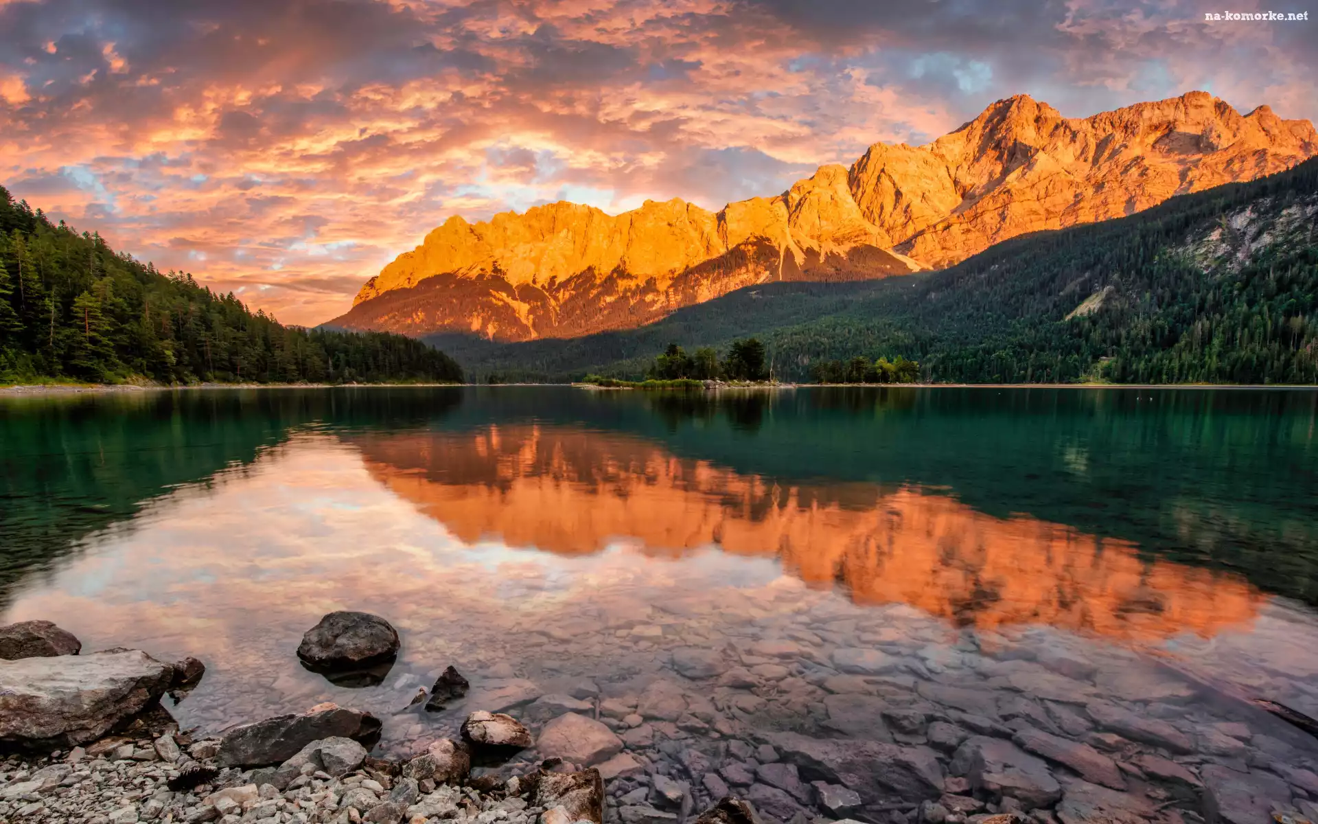Jezioro, Kamienie, Lasy, Góry, Drzewa, Chmury, Odbicie, Skały na Komórkę