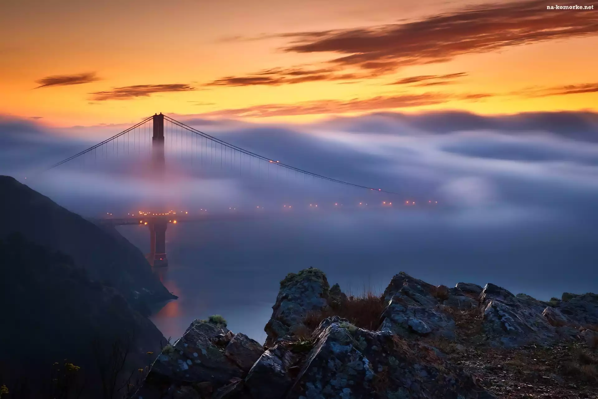 Skały, Zachód, Słońca, Most, Mgła na Komórkę
