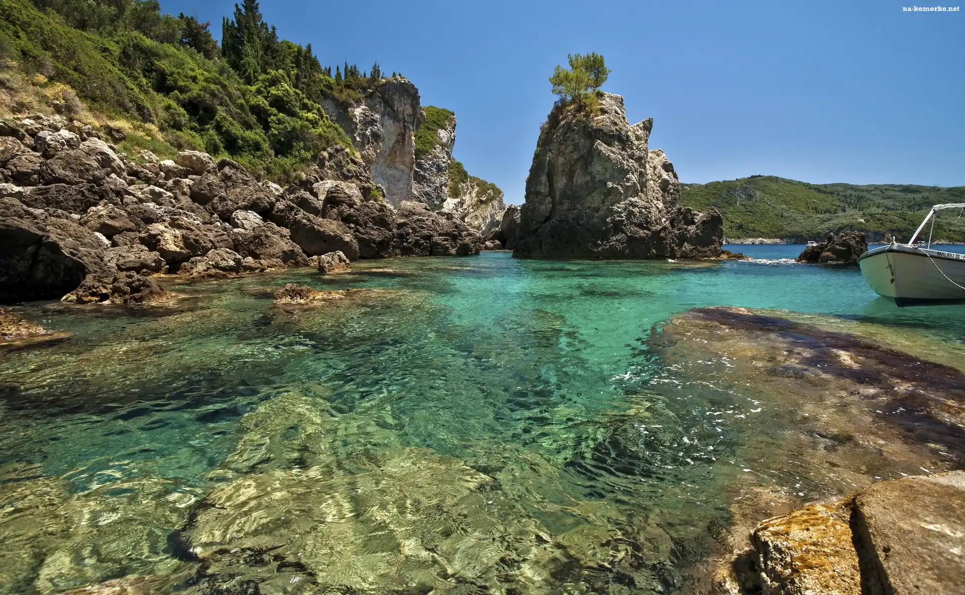 Skały, Jezioro, Zatoka, Motorówka, Kamienie na Komórkę