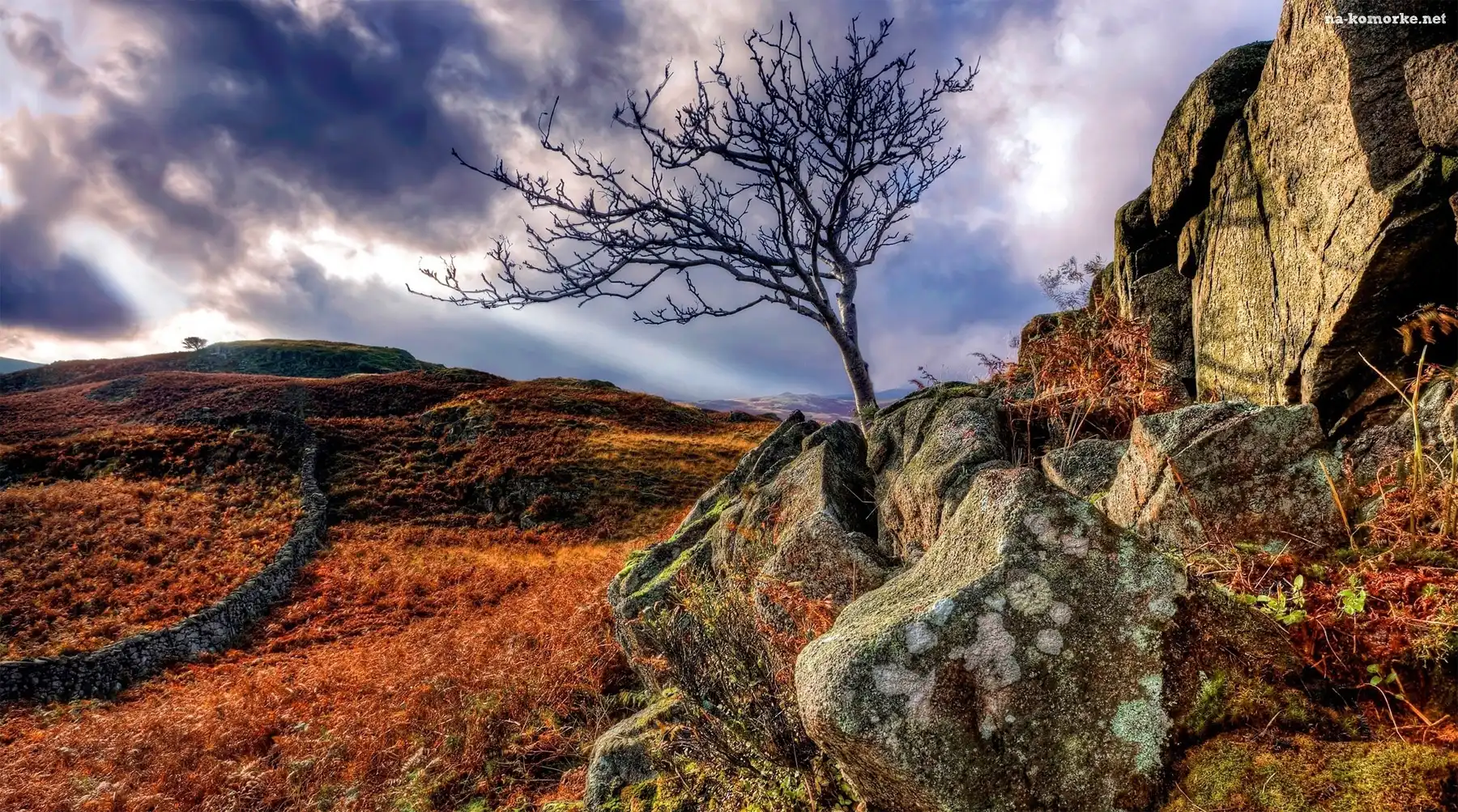 Skały, Kamienie, Jesień, Drzewo, Murek, Chmury na Komórkę