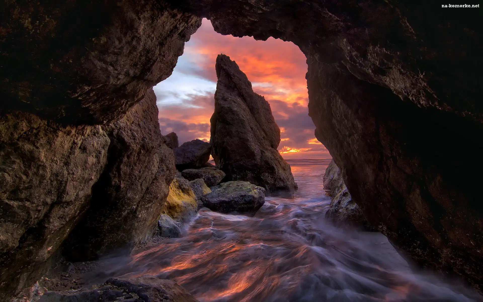 Skały, Zachód słońca, Plaża Ruby Beach, Morze, Stany Zjednoczone, Jaskinia, Stan Waszyngton, Kamienie, Park Narodowy Olympic na Komórkę |