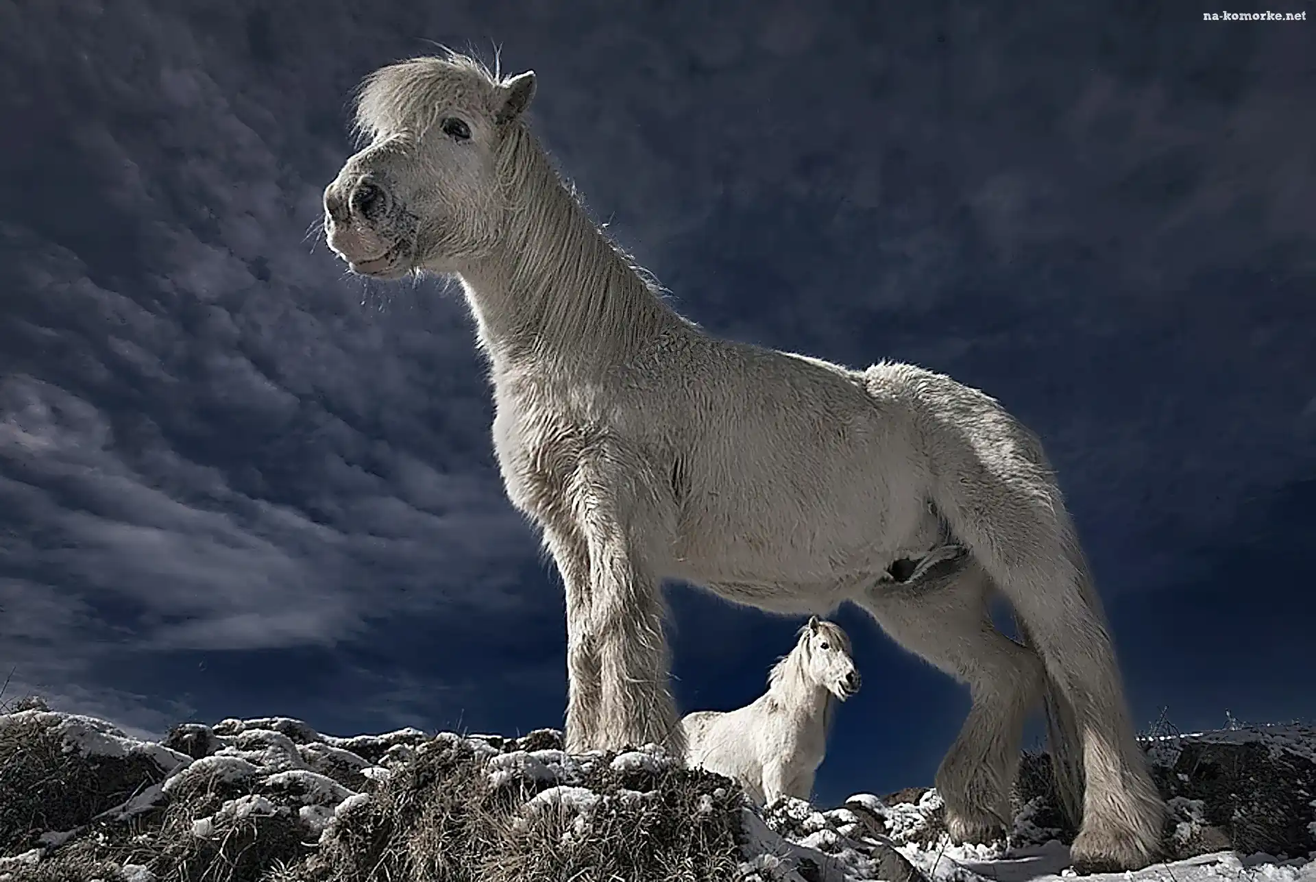 Skały, Białe, Konie, Niebo, Śnieg na Komórkę