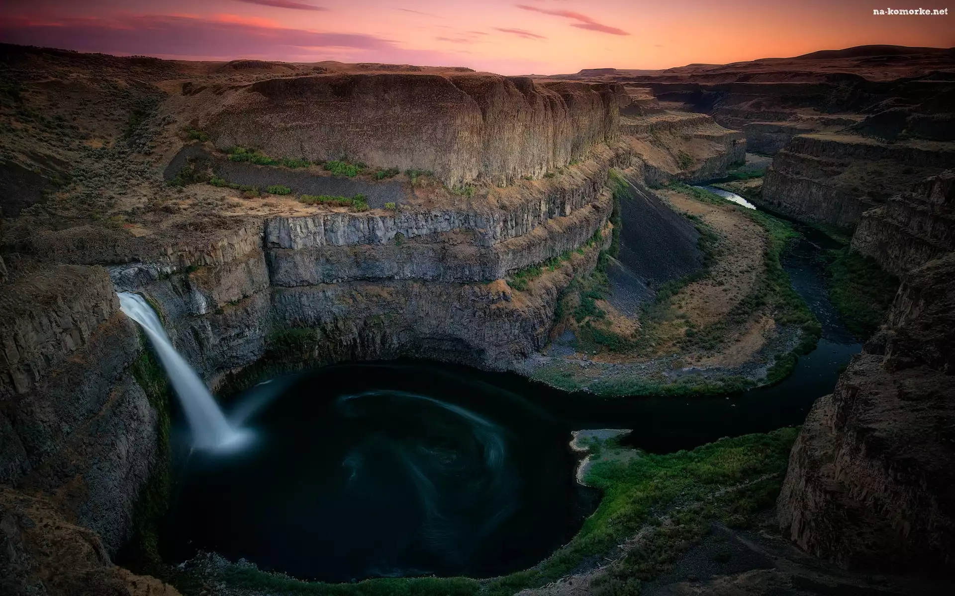 Skały, Wodospad, Stany Zjednoczone, Wąwóz, Stan Waszyngton, Zachód słońca, Wyżyna Kolumbii, Palouse Falls, Rzeka, Palouse River na Komórkę |