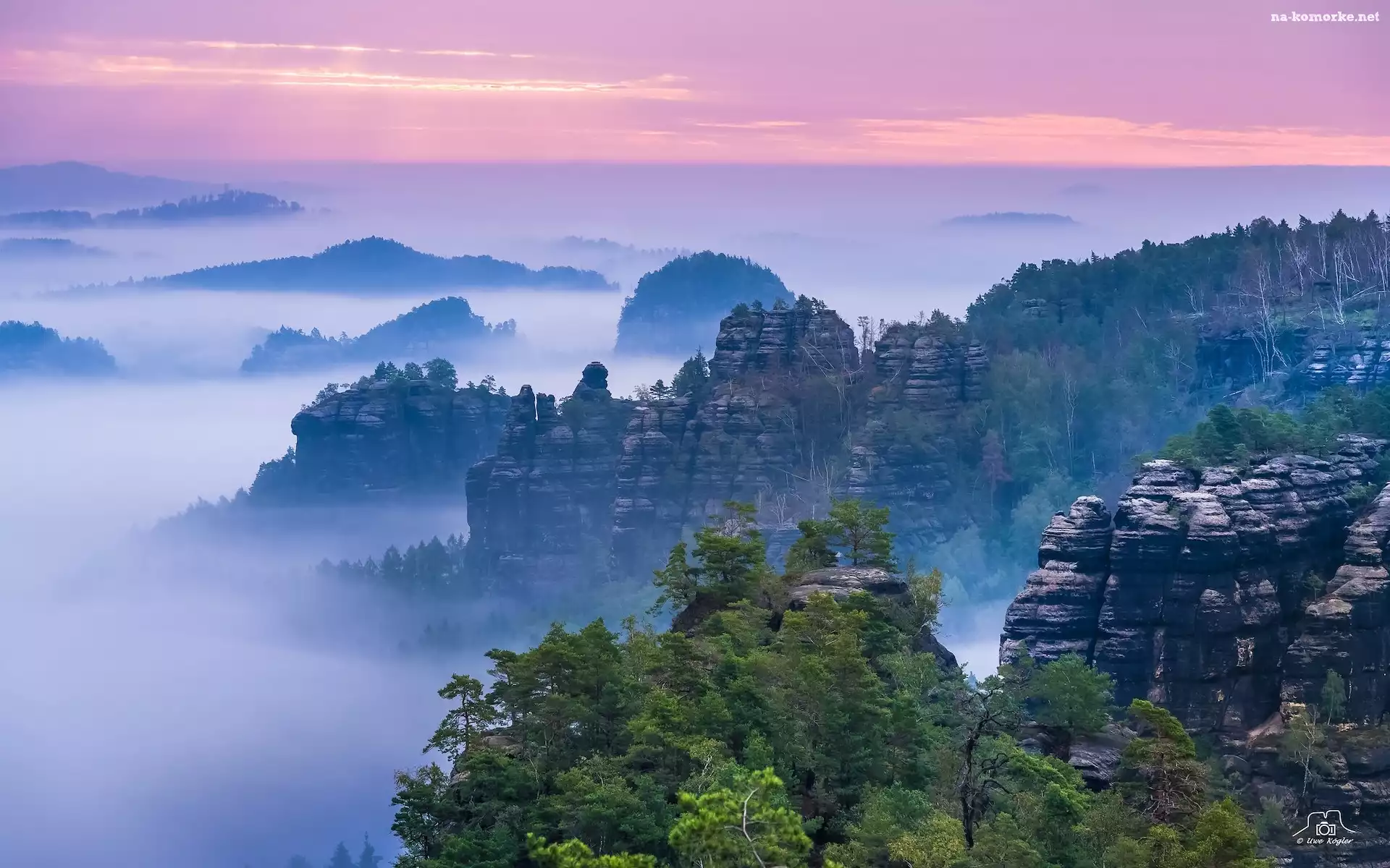 Drzewa, Mgła, Niemcy, Poranek, Góry Połabskie, Skały, Park Narodowy Saskiej Szwajcarii na Komórkę
