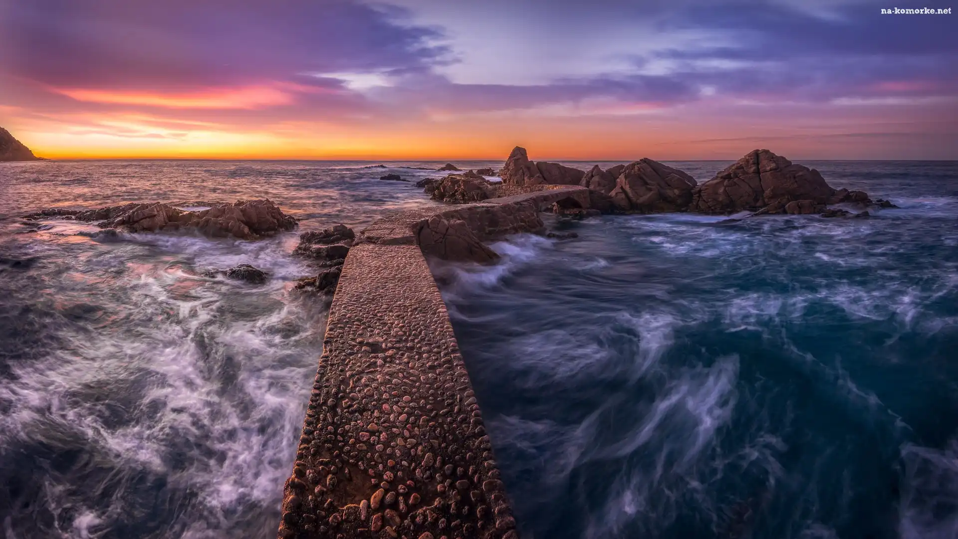 Hiszpania, Skały, Zachód słońca, Katalonia, Morze, Kamienny, Pomost na Komórkę