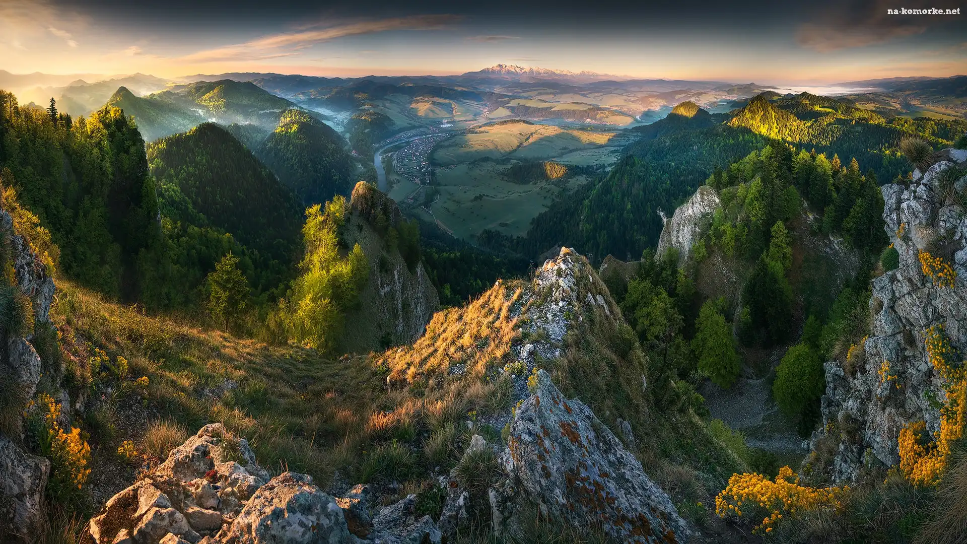 Trawa, Wschód słońca, Skały, Las, Góry, Mgła na Komórkę