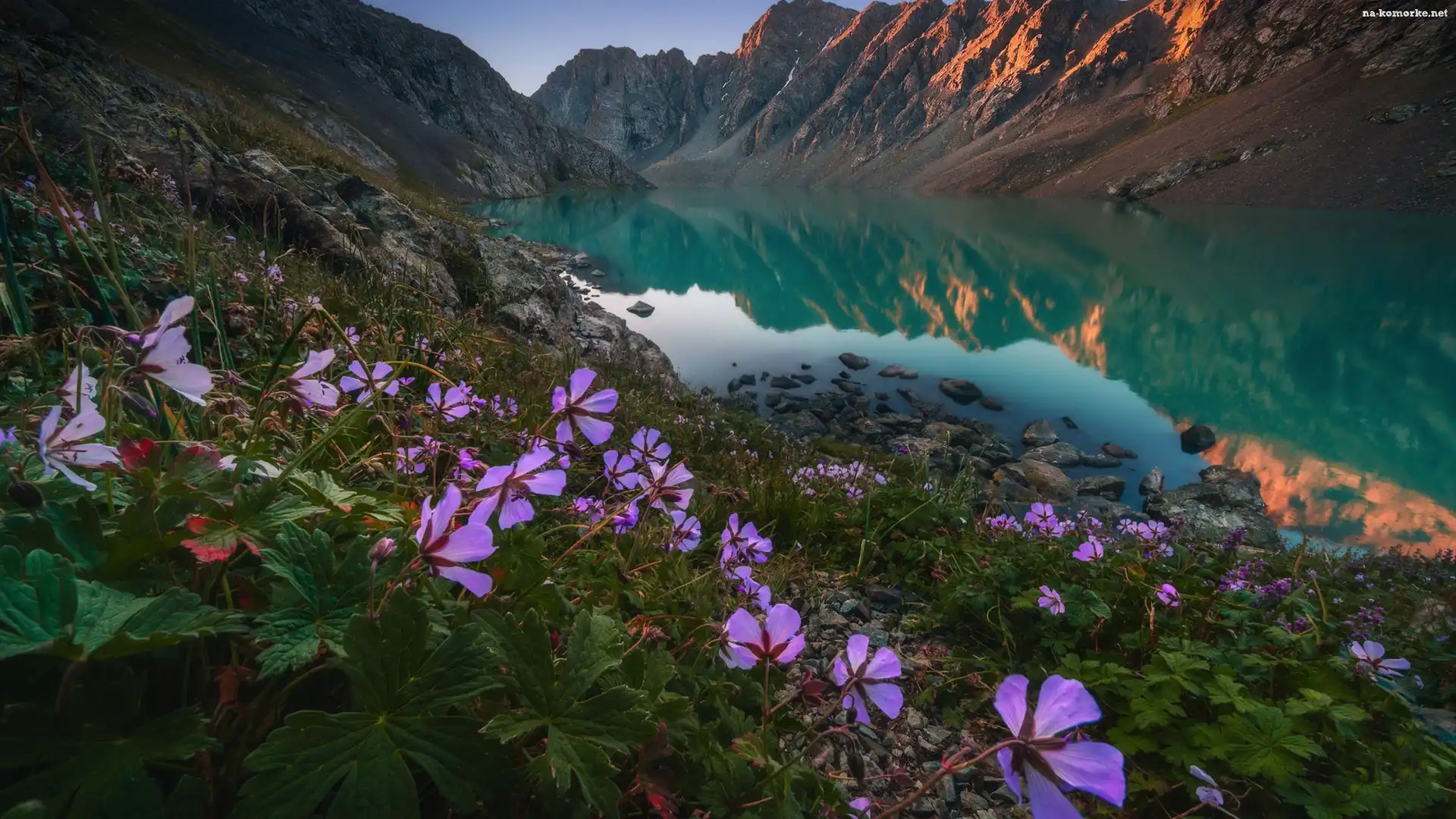 Odbicie, Góry Tienszan, Kwiaty, Kirgistan, Jezioro Ala-Kul, Skały na Komórkę