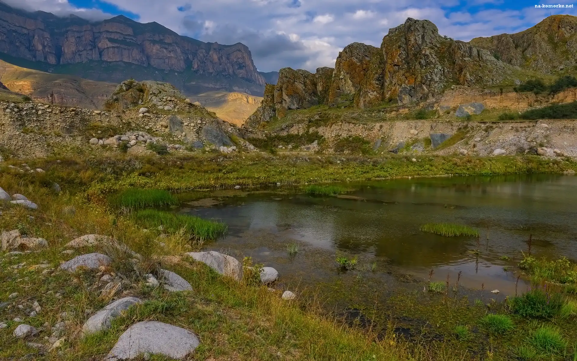 Skały, Góry, Jezioro, Trawa, Kamienie na Komórkę