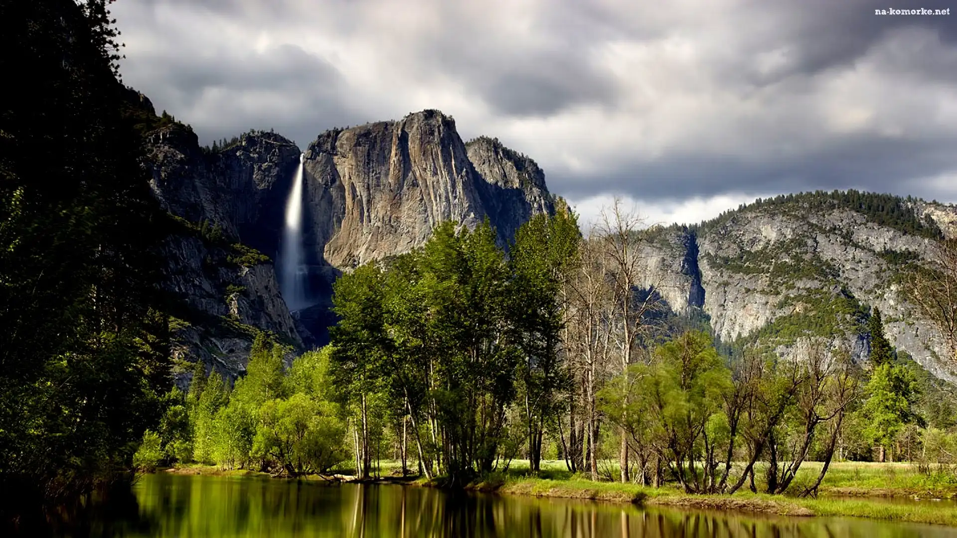 Skały, Drzewa, Wodospad, Jezioro na Komórkę