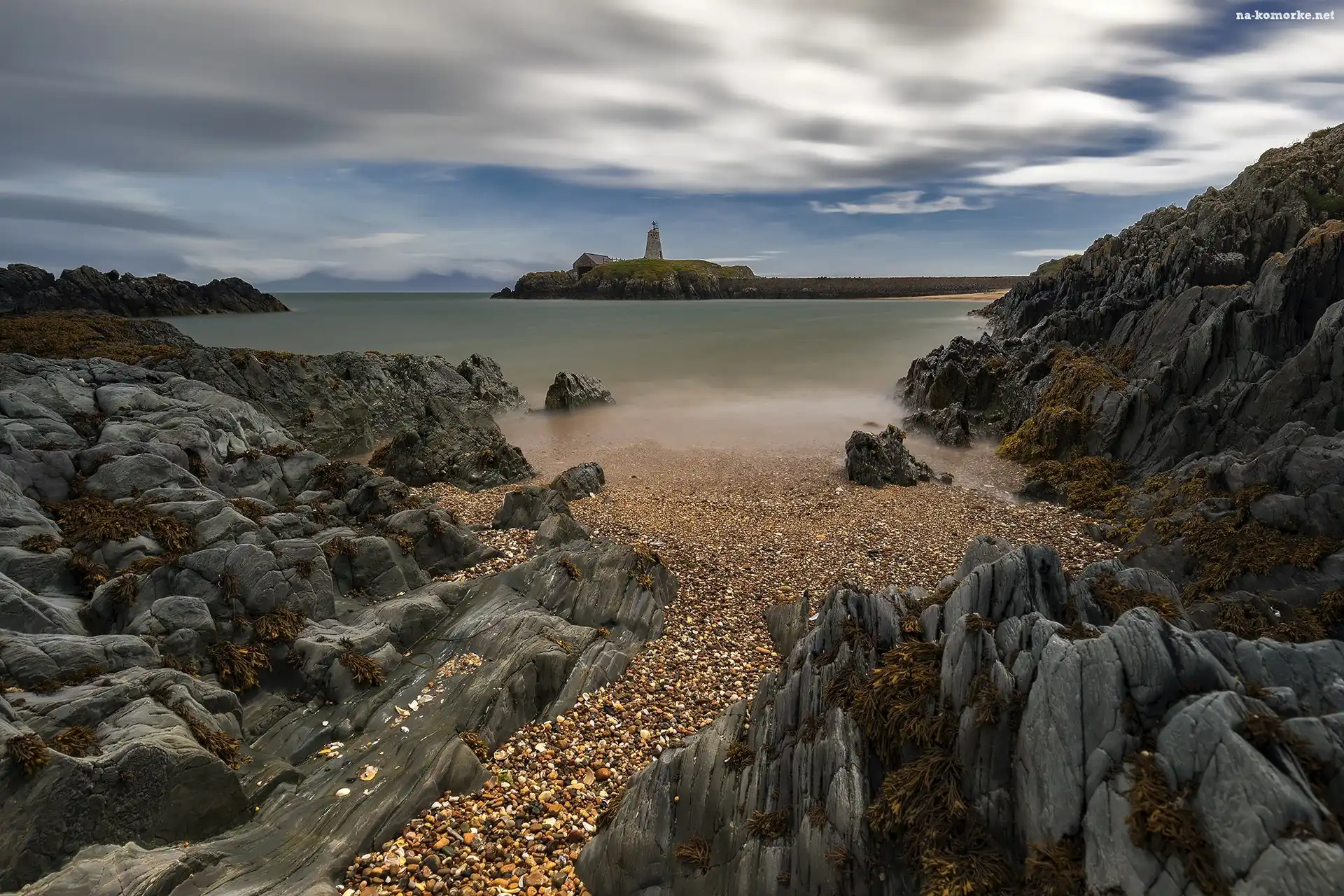 Morze, Walia, Wyspa Anglesey, Latarnia morska Llanddwyn Lighthouse, Skały na Komórkę