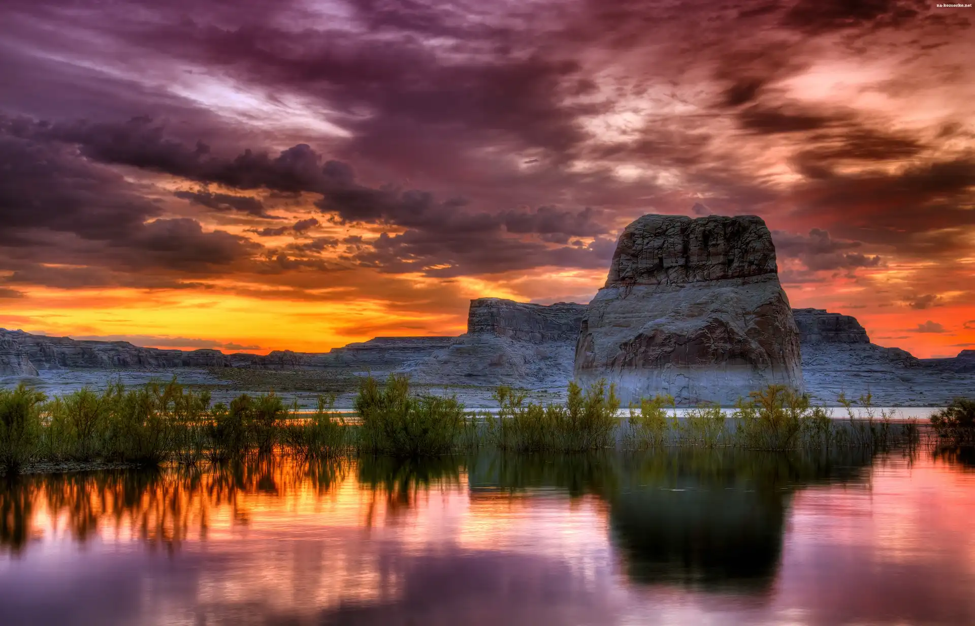 Skały, Jezioro, Chmury, Zachód, Słońca na Komórkę