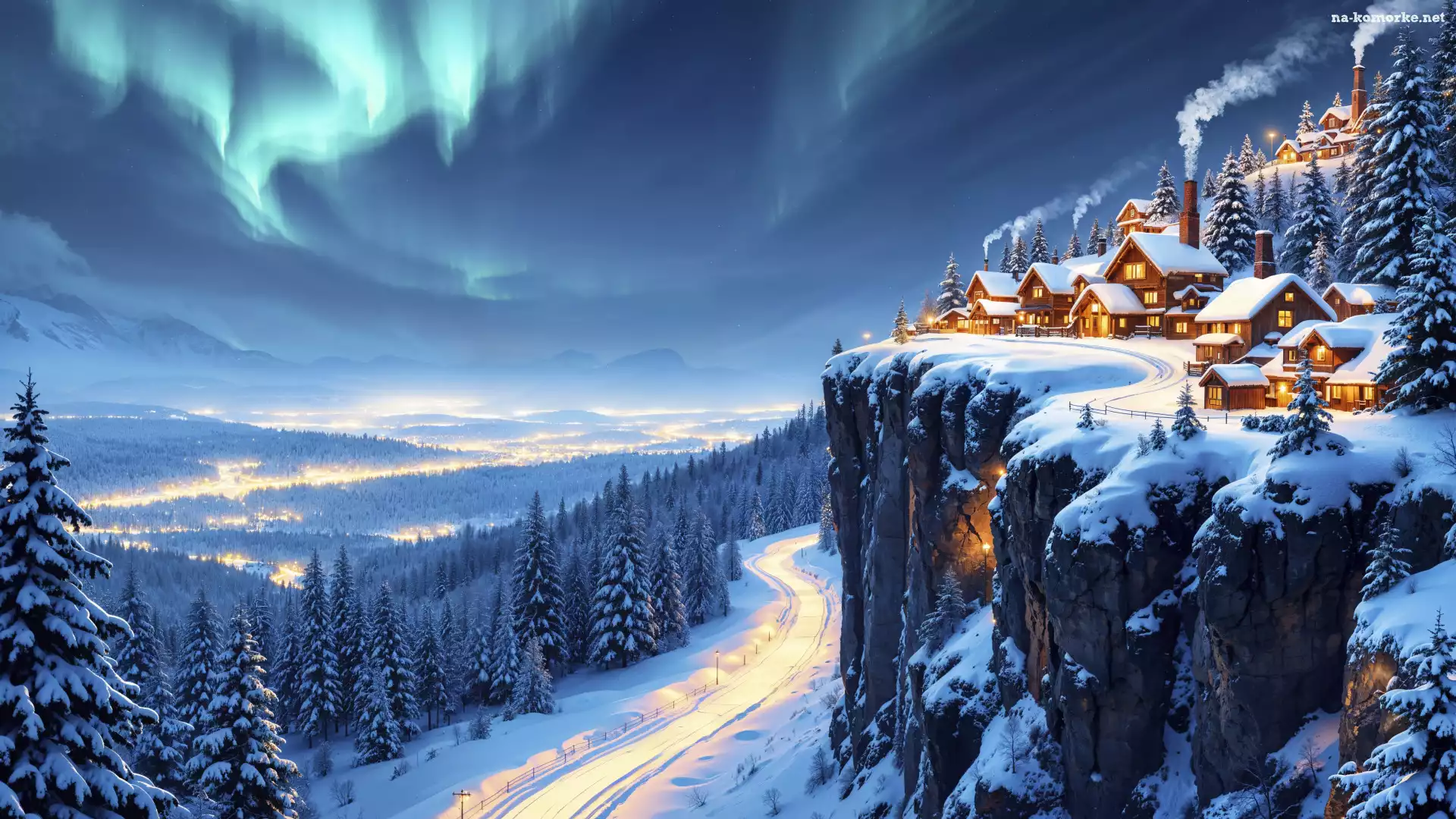 Droga, Las, Zima, Zorza polarna, Domy, Dolina, Skały na Komórkę
