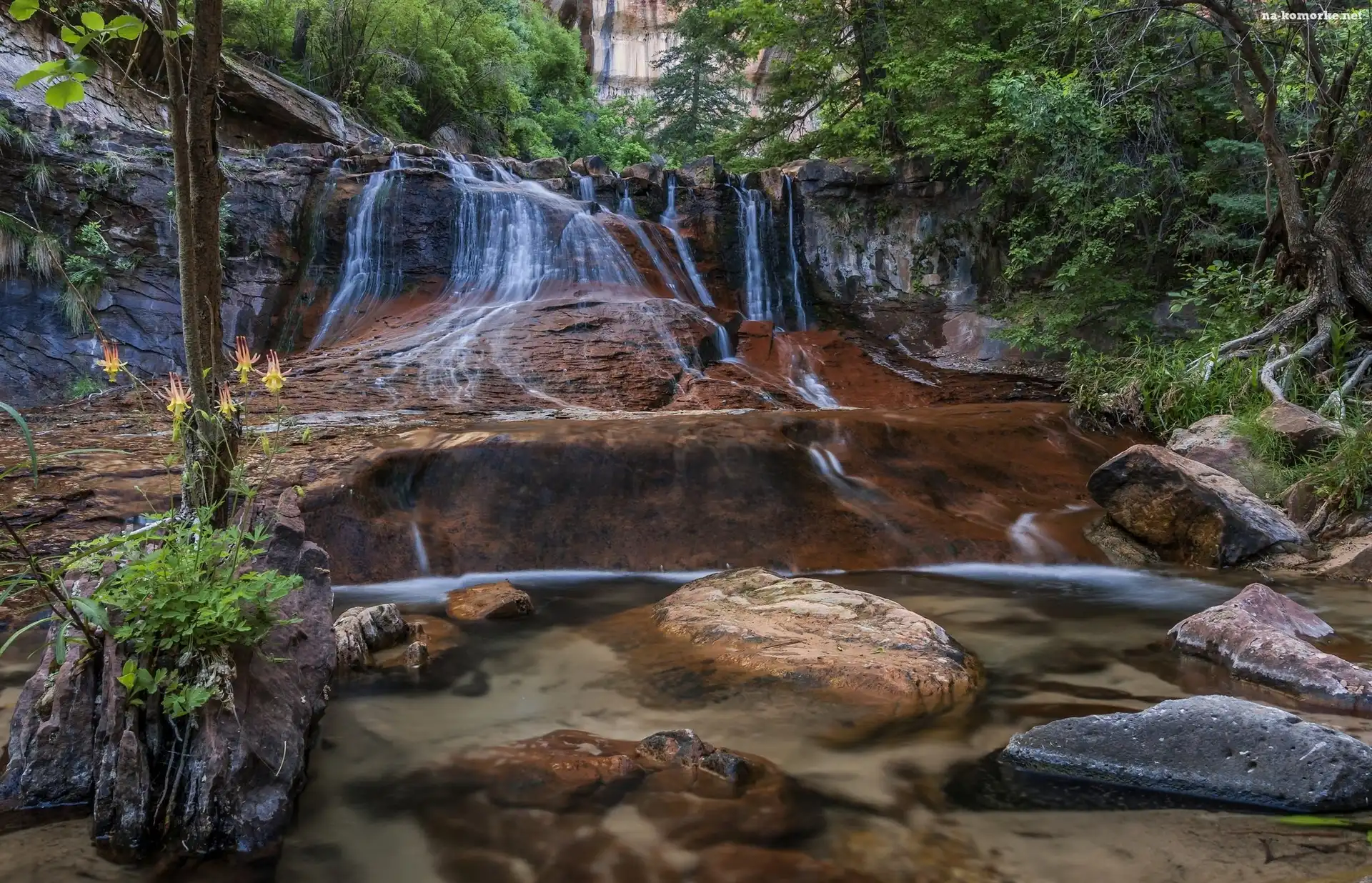 Wodospad, Stan Utah, Stany Zjednoczone, Las, Park Narodowy Zion, Skały na Komórkę