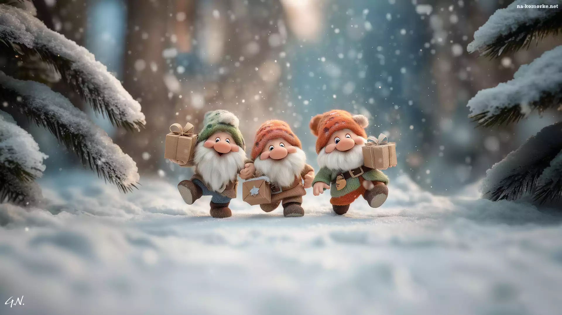 Trzy, Choinki, Zima, Skrzaty, Grafika AI na Komórkę
