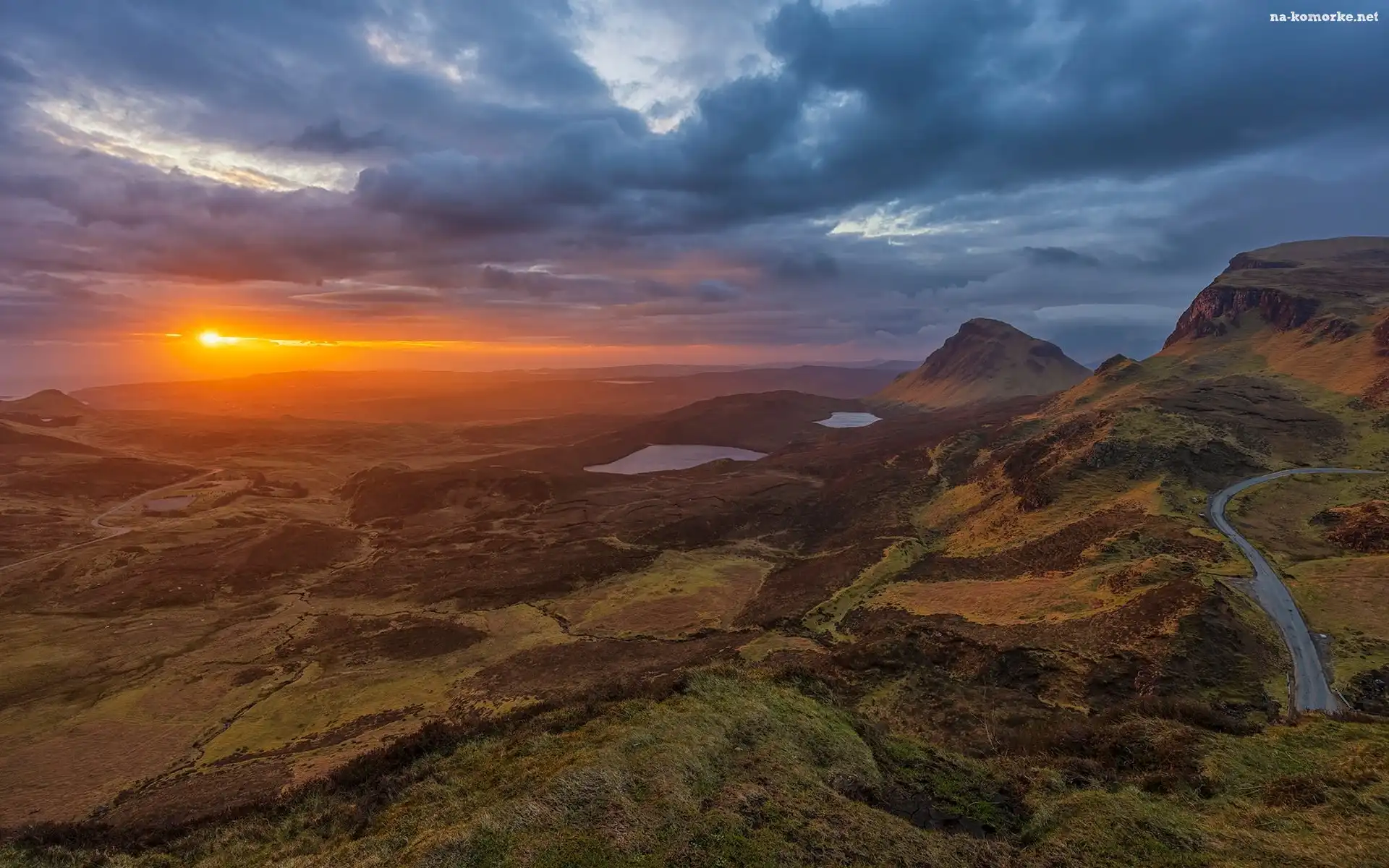 Jeziora, Góry, Chmury, Wzgórza, Quiraing, Wyspa Skye, Szkocja, Ścieżka, Zachód słońca na Komórkę |