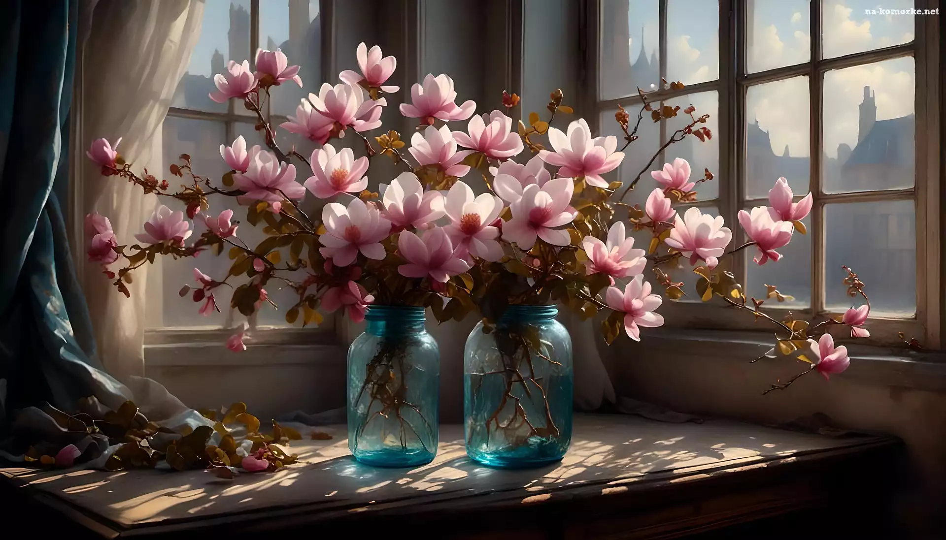 Kwiaty, Słoiki, Stół, Magnolia, Okno na Komórkę