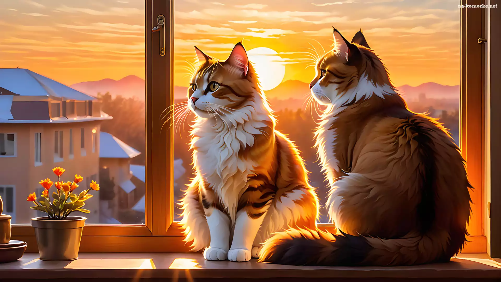 Dwa, Okno, Zachód słońca, Koty, 2D na Komórkę