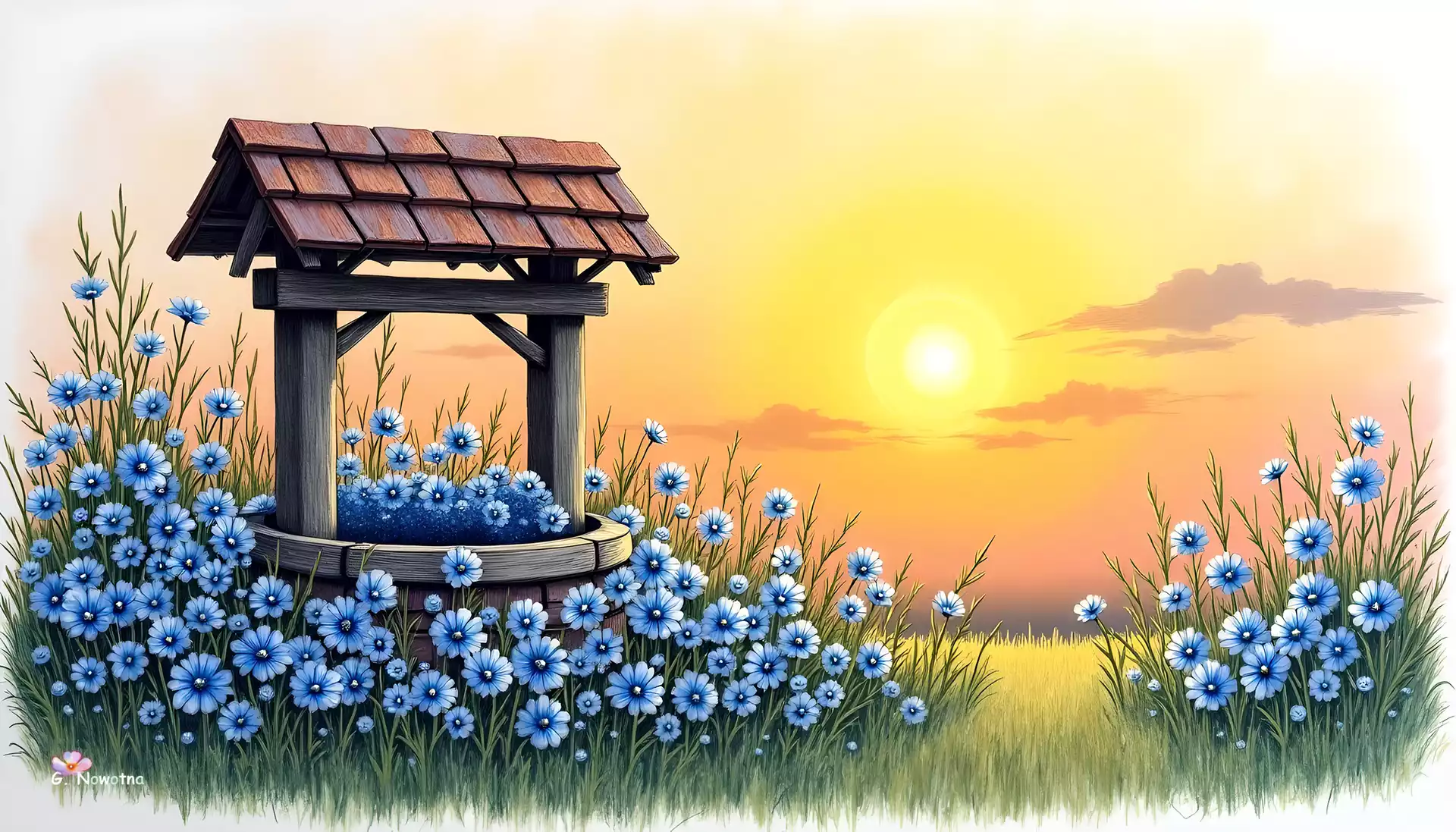 Niebieskie, Studnia, Zachód słońca, Kwiaty, 2D na Komórkę