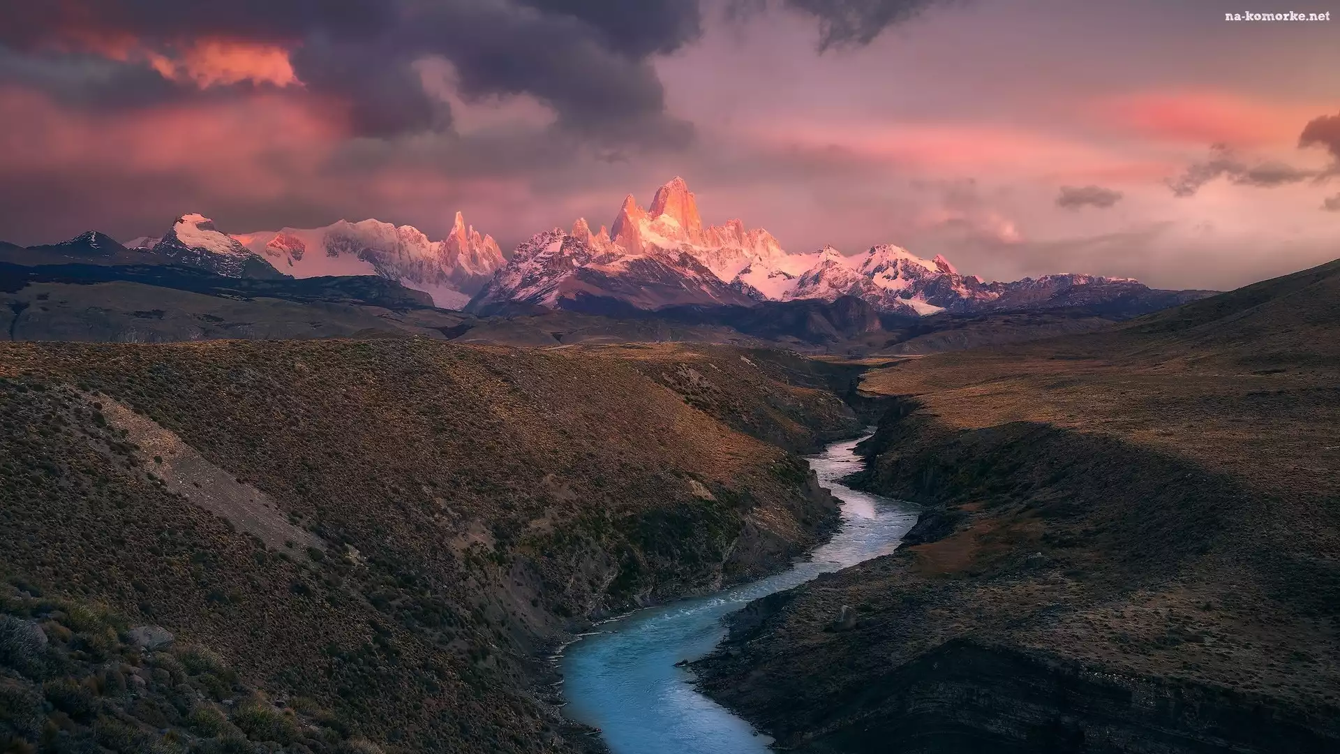 Skarpa, Park Narodowy Los Glaciares, Wschód słońca, Argentyna, Chmury, Rzeka, Góry na Komórkę