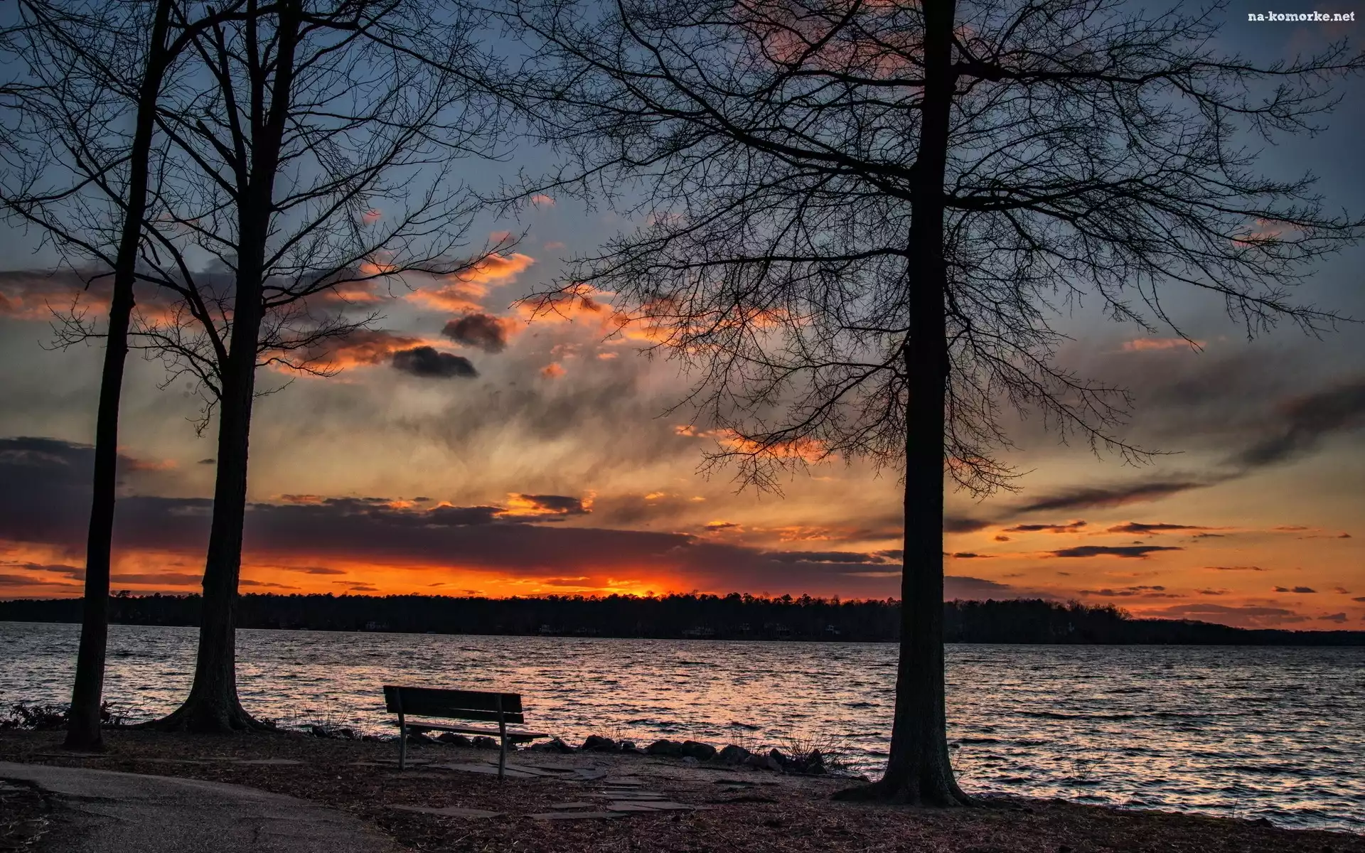 Słońca, Rzeka, Drzewa, Ławka, Zachód na Komórkę