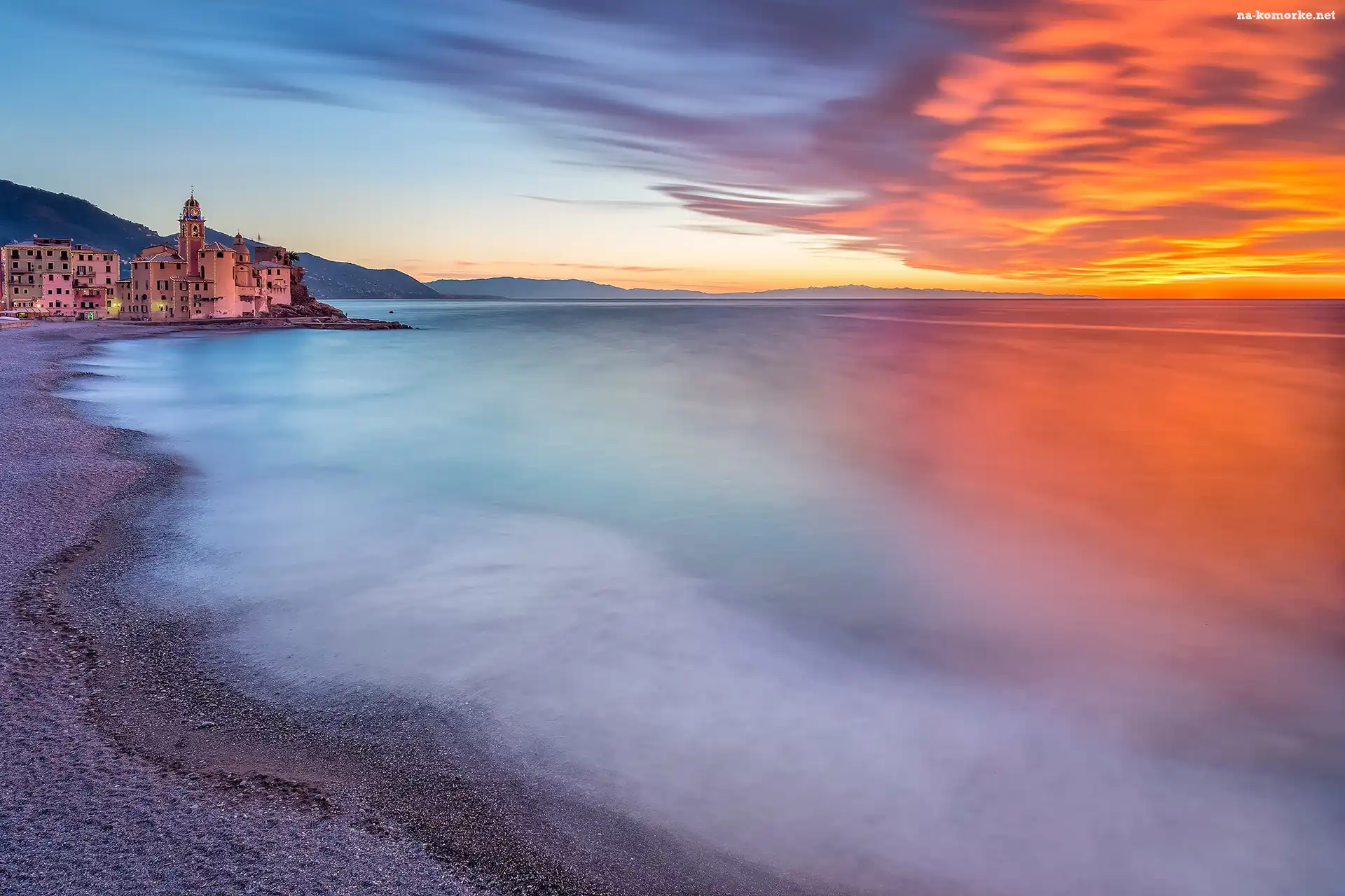 Włochy, Morze, Camogli, Chmury, Liguria, Kościół, Budynki, Zachód słońca na Komórkę