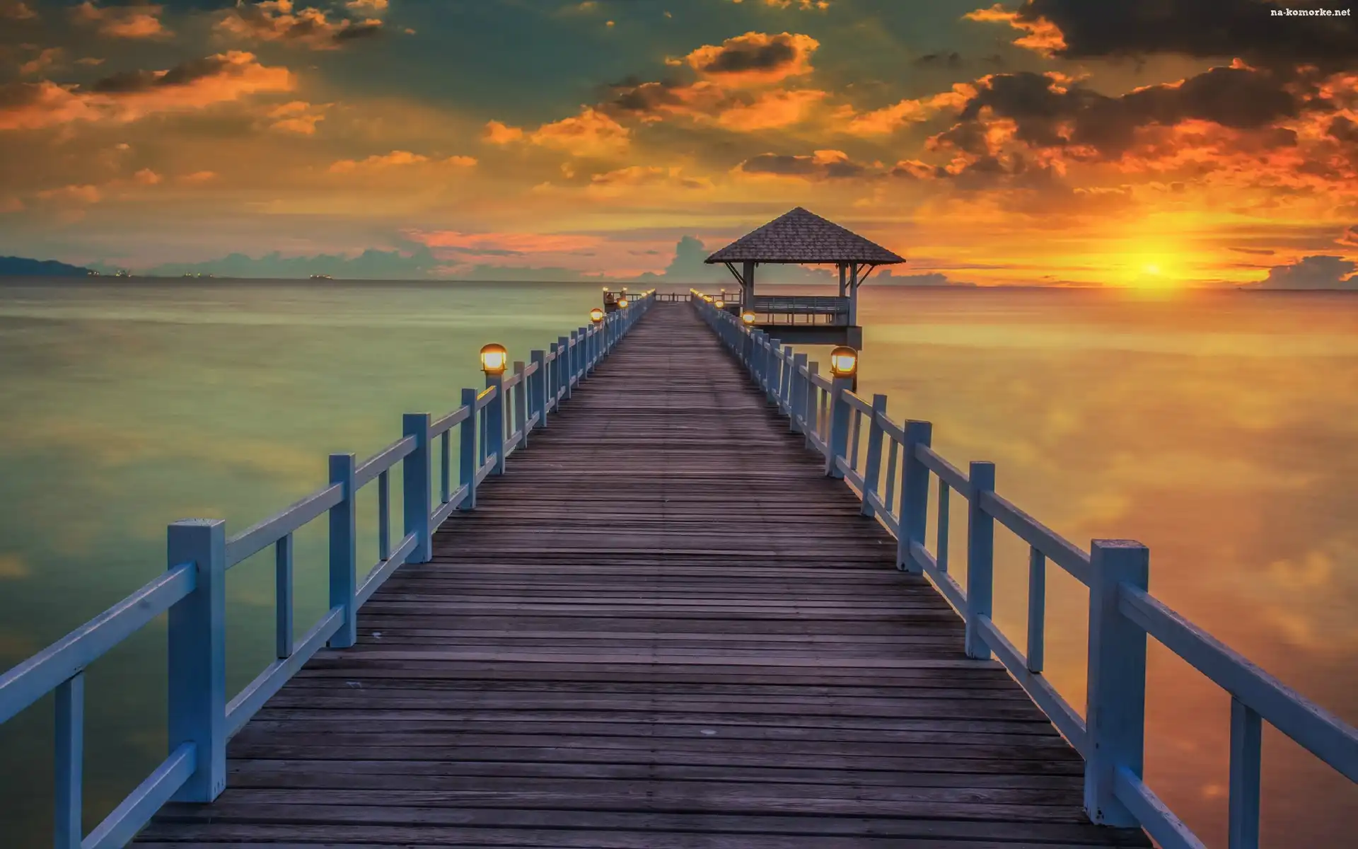 Słońca, Pomost, Morze, Chmury, Zachód na Komórkę