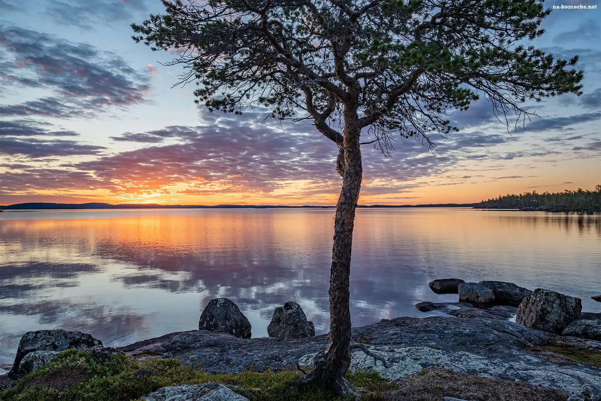 Zachód słońca, Lake Inari, Jezioro, Finlandia, Drzewo, Chmury na Komórkę