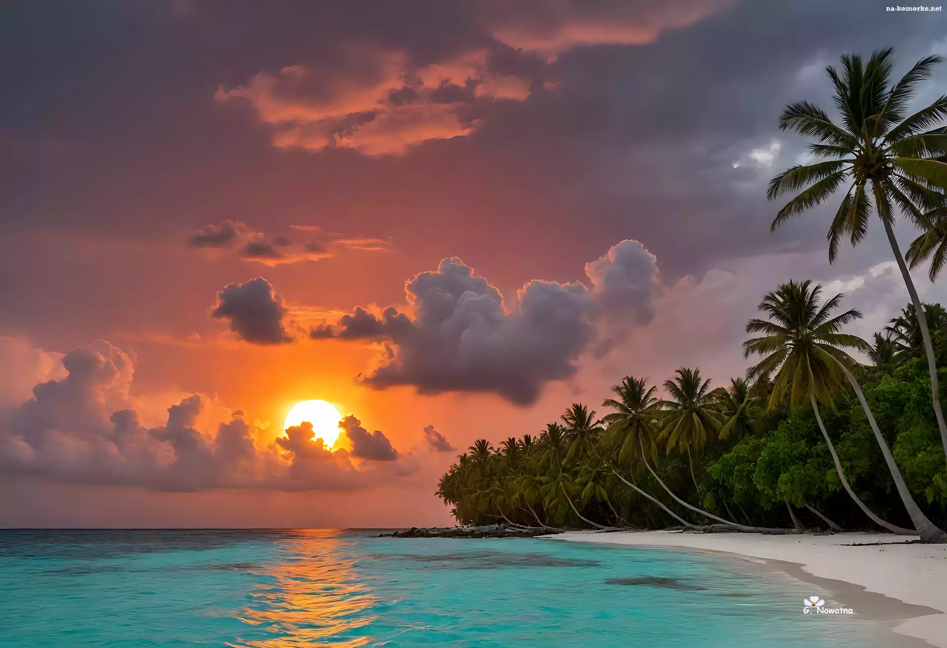 Morze, Plaża, Zachód słońca, Palmy, Chmury na Komórkę