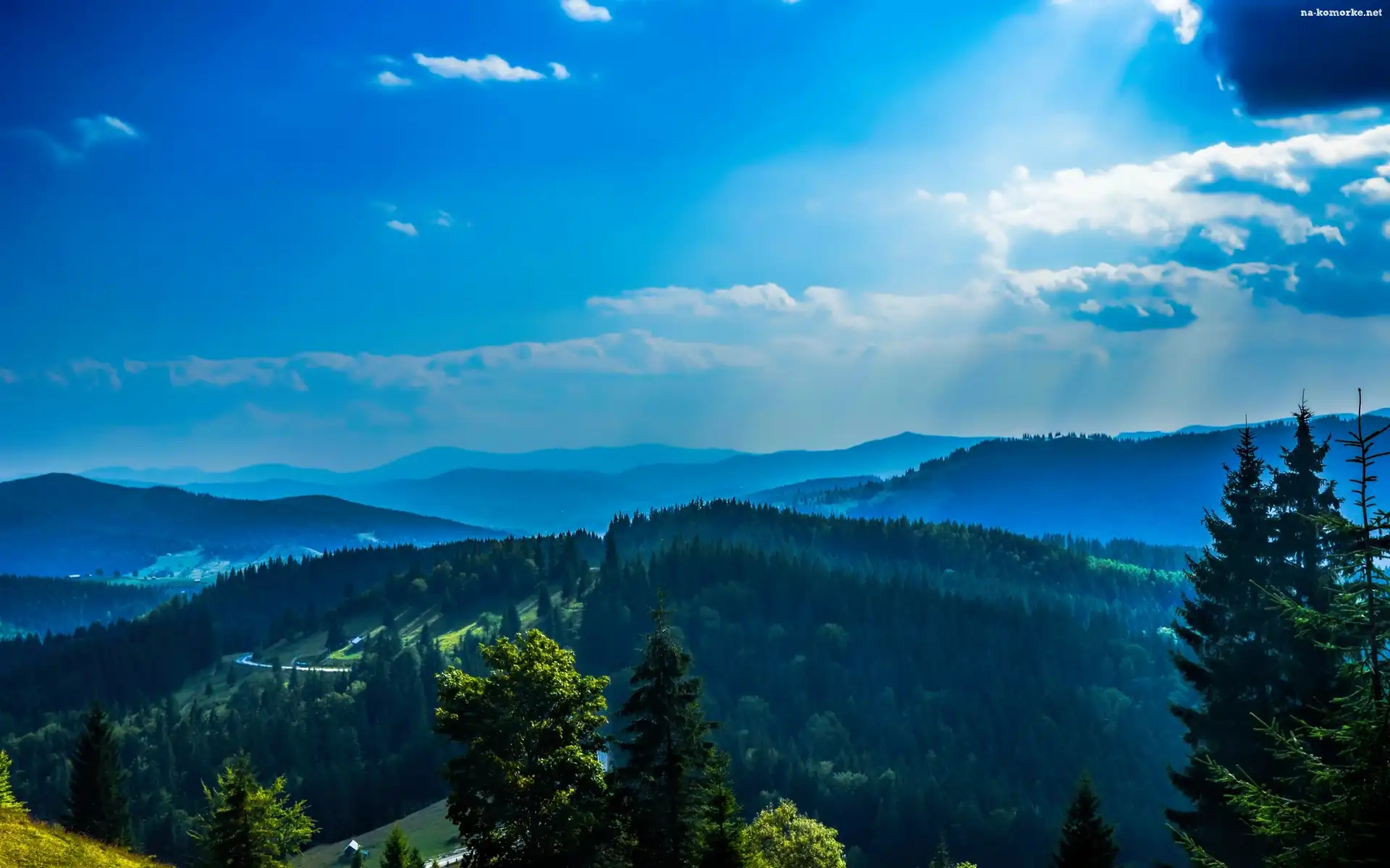 Słońca, Góry, Lasy, Droga, Promienie na Komórkę
